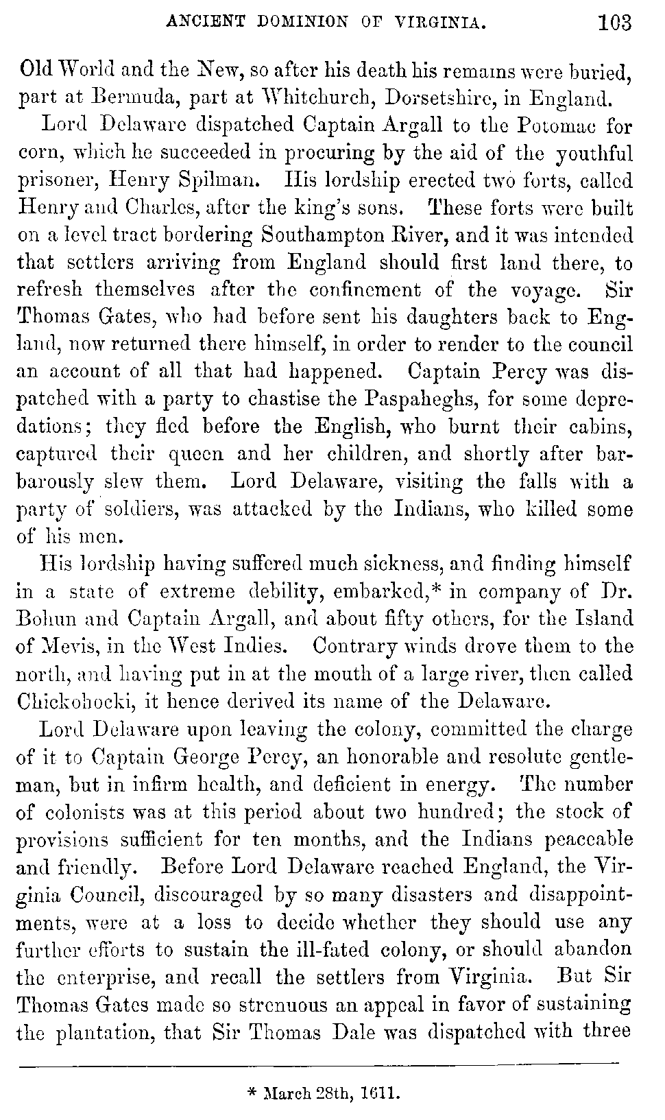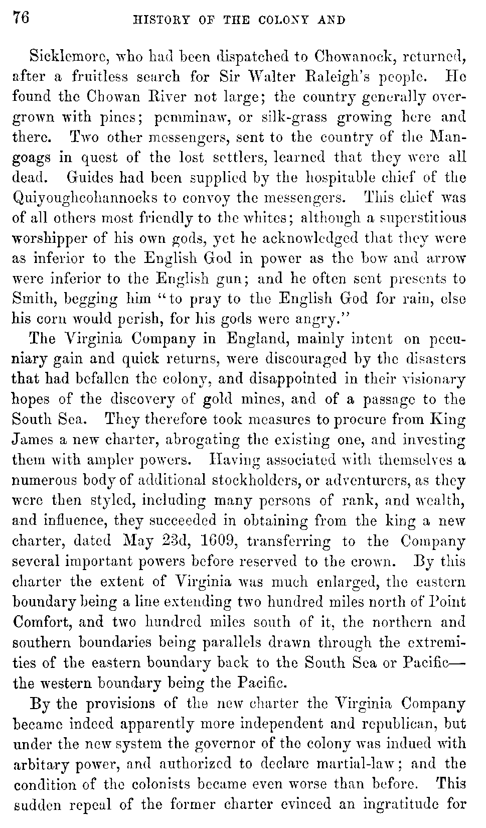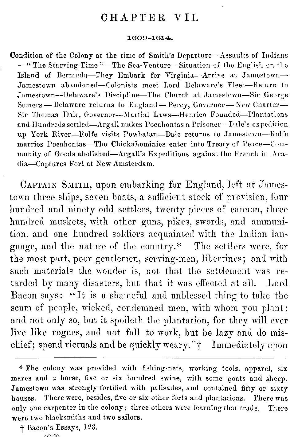 | VII. | —Sufferings of the Colonists. Wreck of the Sea-Venture. Miscellaneous Affairs. Percy, President. Lord Delaware, Governor. Percy, Acting Governor. Sir Thomas Dale, High Marshal. Sir Thomas Gates, Governor. | 92 |