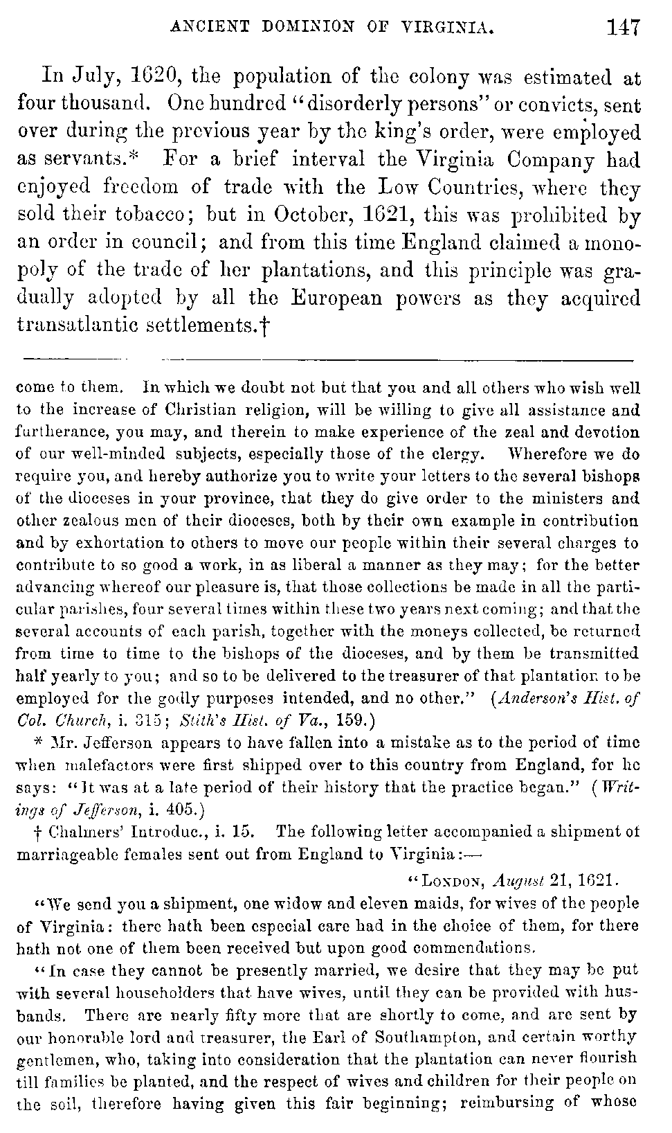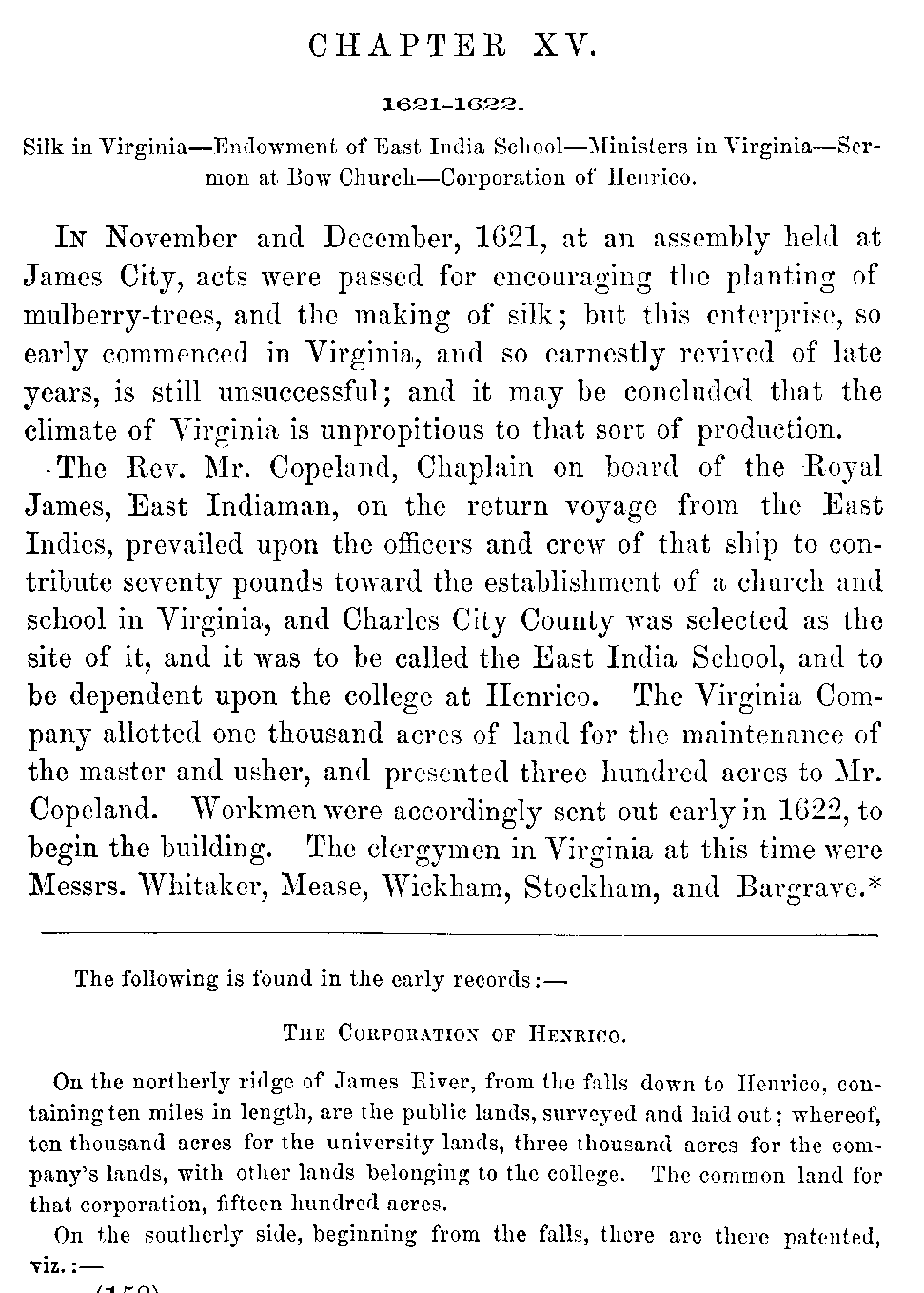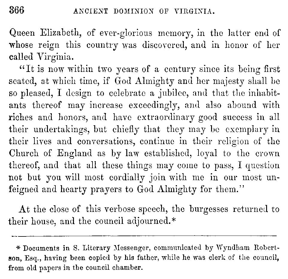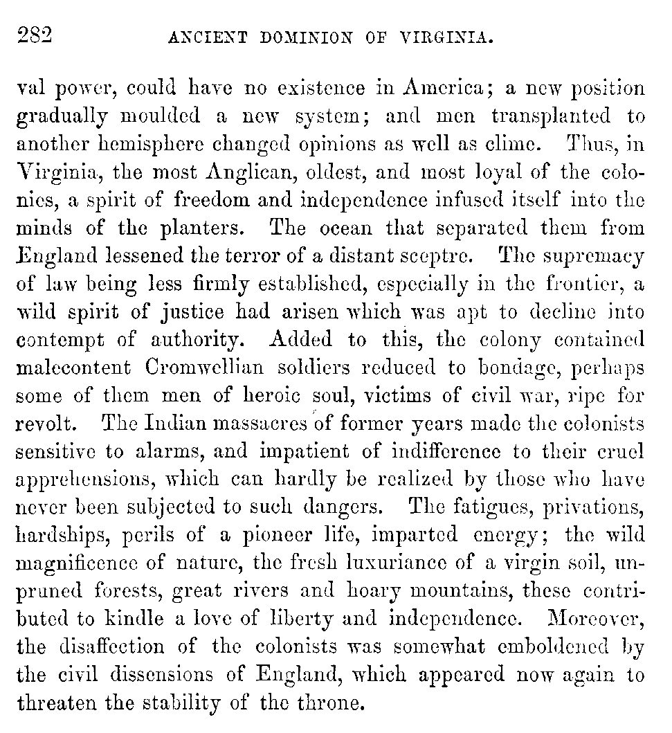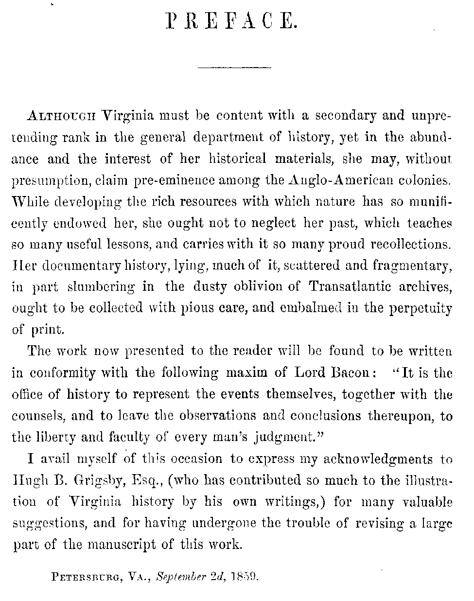 Although Virginia must be content with a secondary and unpretending rank in the general department of history, yet in the abundance and the interest of her historical materials, she may, without presumption, claim pre-eminence among the Anglo-American colonies. While developing the rich resources with which nature has so munificently endowed her, she ought not to neglect her past, which teaches so many useful lessons, and carries with it so many proud recollections. Her documentary history, lying, much of it, scattered and fragmentary, in part slumbering in the dusty oblivion of Transatlantic archives, ought to be collected with pious care, and embalmed in the perpetuity of print.