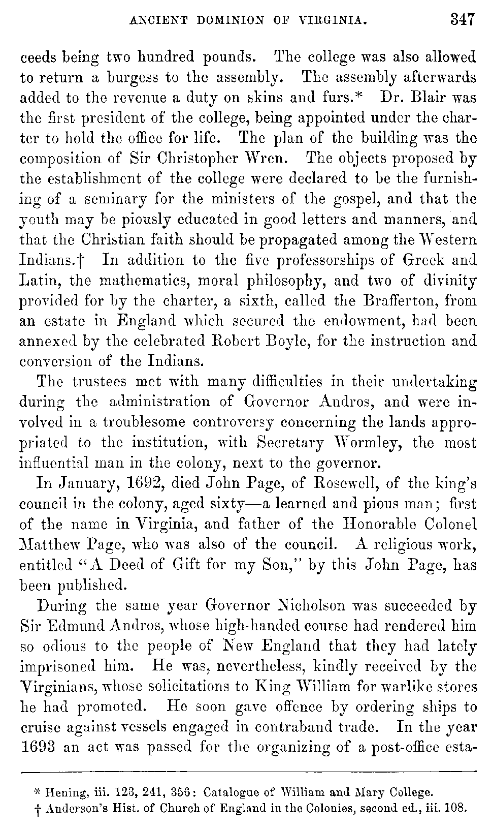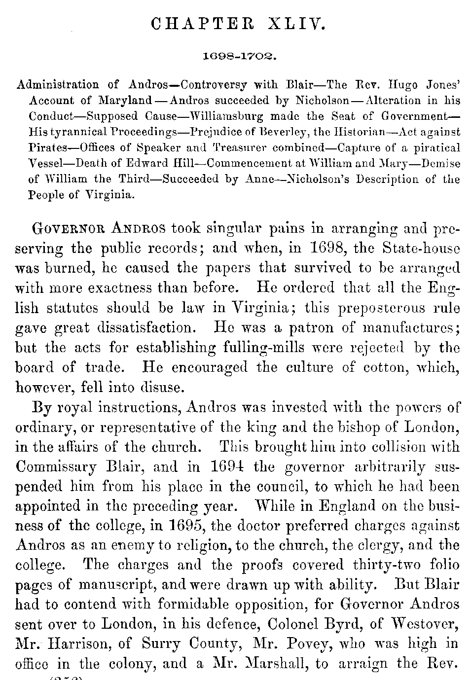 | XLII. | —William and Mary proclaimed. College chartered. Andros, Governor. | 343 |