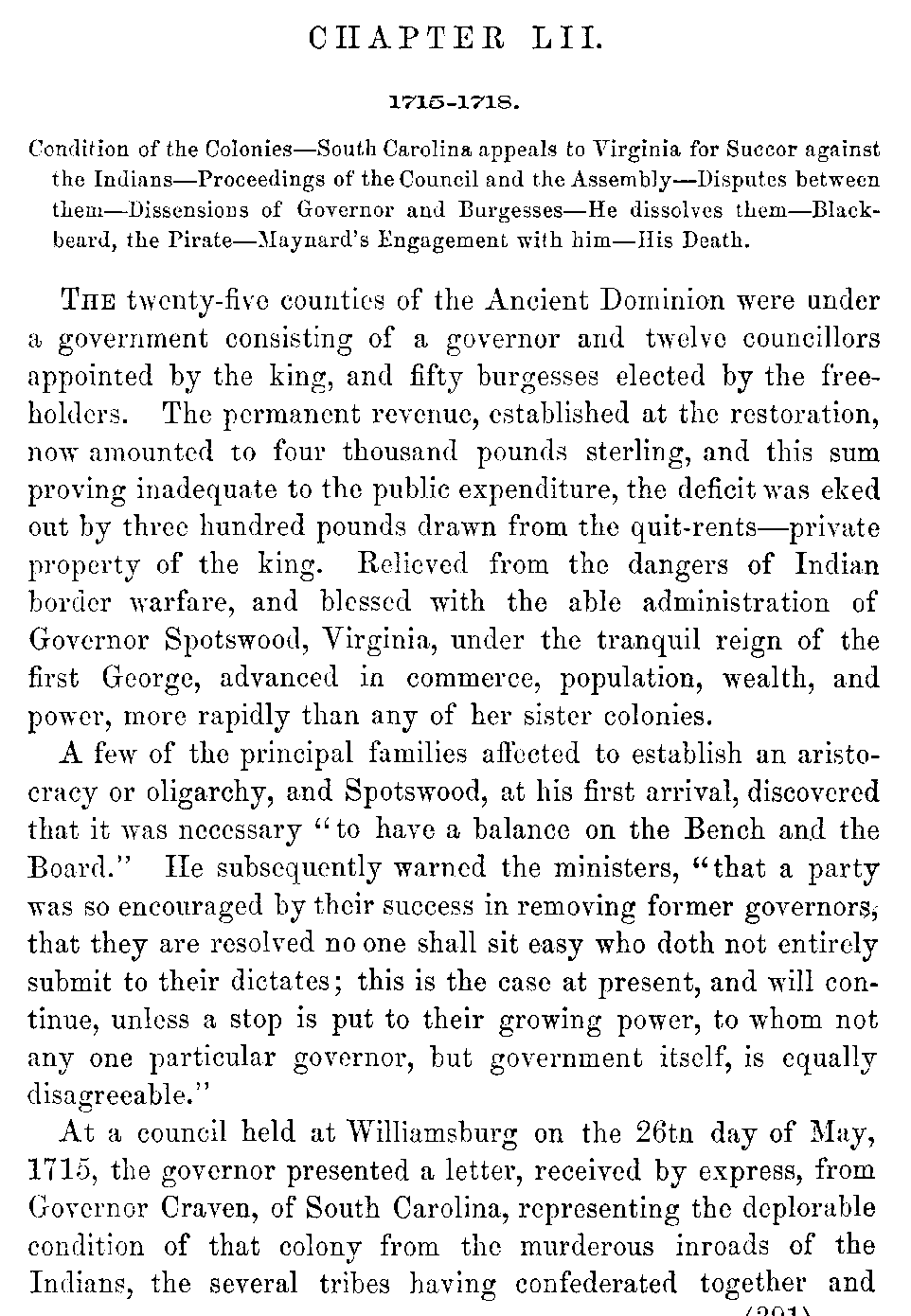 | LII. | —Virginia succours South Carolina. Disputes between Spotswood and the Burgesses. Blackbeard. | 391 |