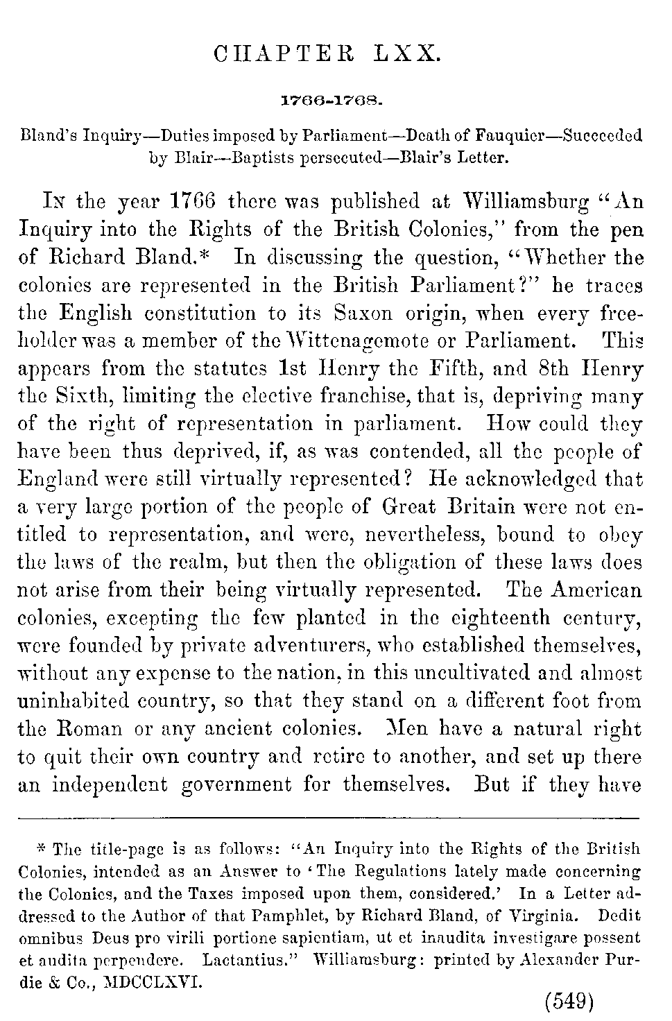 | LXX. | —Bland's Inquiry. Death of Fauquier. Persecution of Baptists. Blair's tolerant Spirit. | 549 |