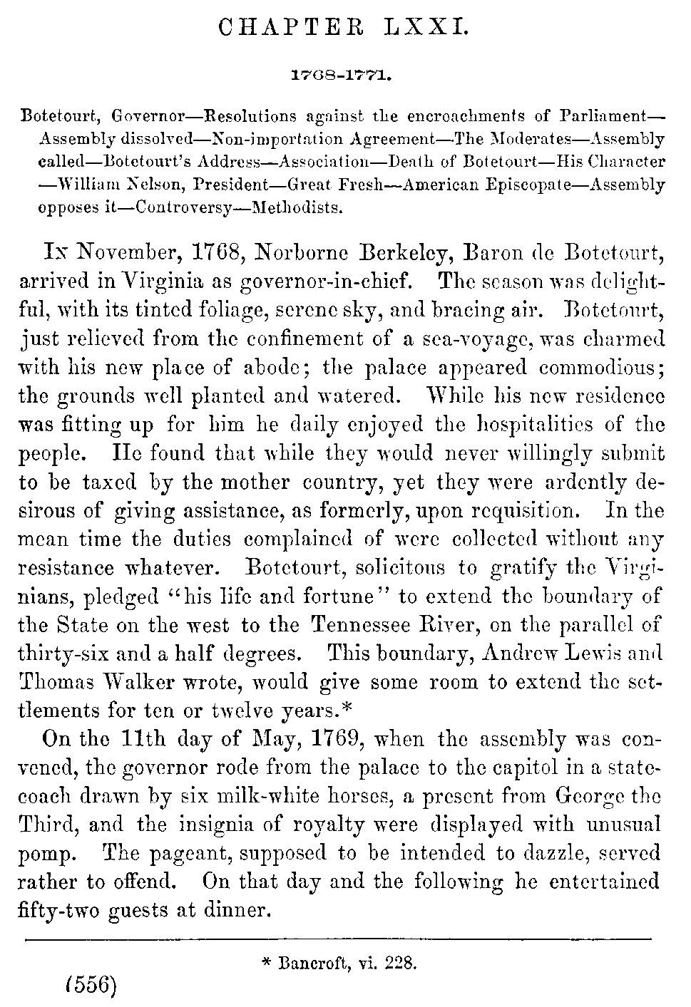 | LXXI. | —Botetourt, Governor. Parliamentary Measures resisted. Death of Botetourt. Nelson, President. American Episcopate. | 550 |