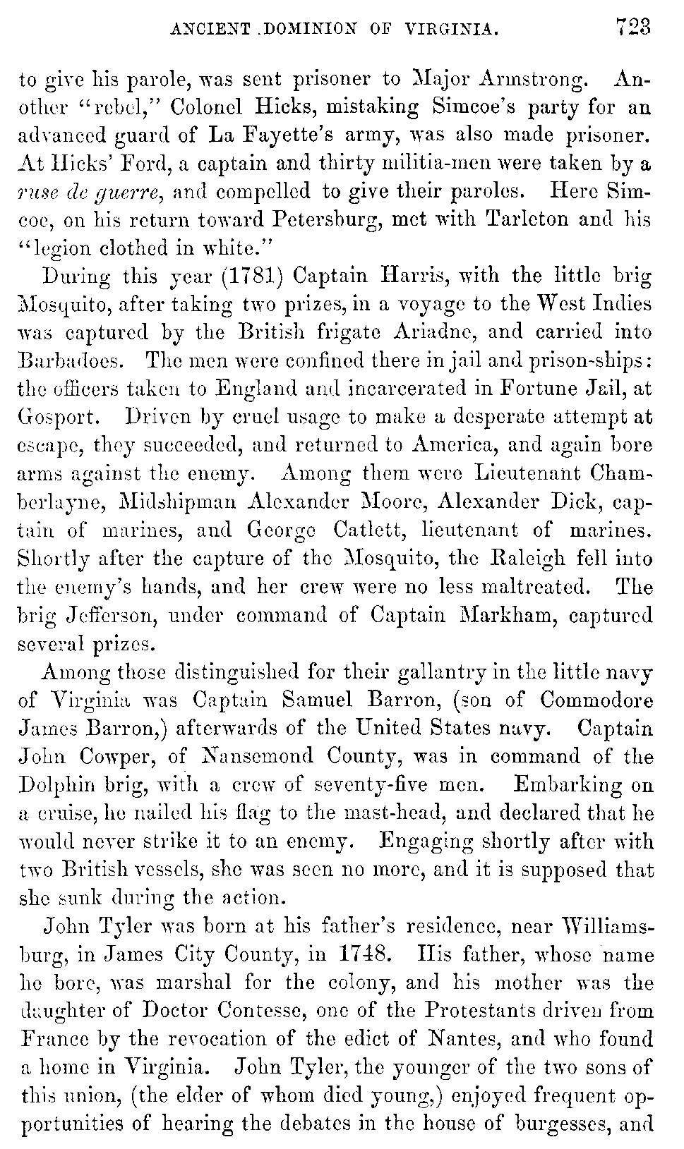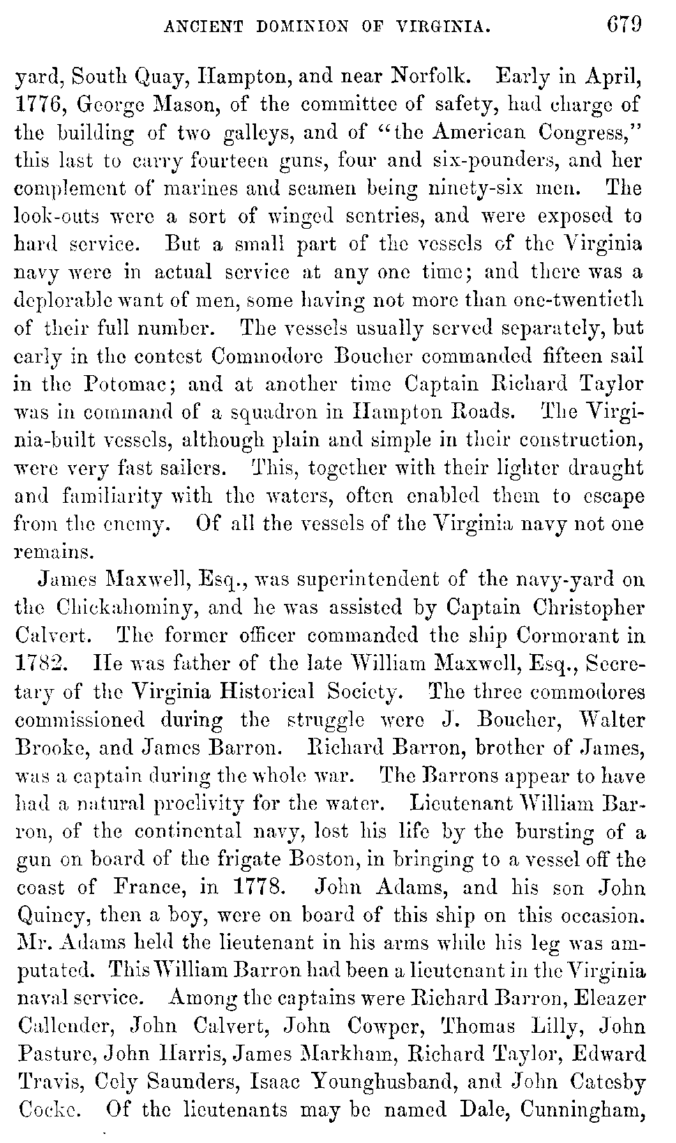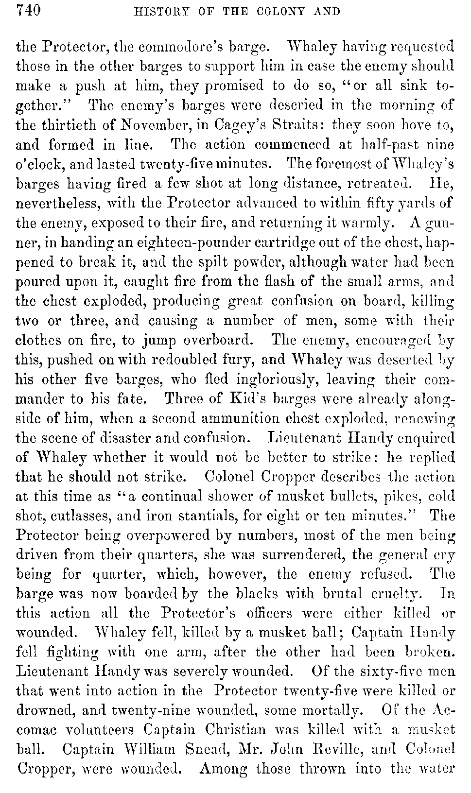 In 1782 Maryland sent out Commodore Whaley, with some barges, to protect the Eastern Shore of that State against bucaneering crafts manned by British sailors, and tories, and negroes. Receiving information of the appearance of a flotilla of such barges in the Chesapeake Bay, under command of a Commodore Kid, a Scotchman, Whaley, deeming them too strong for him, solicited aid from Colonel John Cropper, commander of Accomac County, who, with a party of volunteers, re-enforced him. Colonel Cropper, with several Accomac gentlemen, went on board [740]the Protector, the commodore's barge. Whaley having requested those in the other barges to support him in case the enemy should make a push at him, they promised to do so, "or all sink together." The enemy's barges were descried in the morning of the thirtieth of November, in Cagey's Straits: they soon hove to, and formed in line. The action commenced at half-past nine o'clock, and lasted twenty-five minutes. The foremost of Whaley's barges having fired a few shot at long distance, retreated. He, nevertheless, with the Protector advanced to within fifty yards of the enemy, exposed to their fire, and returning it warmly. A gunner, in handing an eighteen-pounder cartridge out of the chest, happened to break it, and the spilt powder, although water had been poured upon it, caught fire from the flash of the small arms, and the chest exploded, producing great confusion on board, killing two or three, and causing a number of men, some with their clothes on fire, to jump overboard. The enemy, encouraged by this, pushed on with redoubled fury, and Whaley was deserted by his other five barges, who fled ingloriously, leaving their commander to his fate. Three of Kid's barges were already alongside of him, when a second ammunition chest exploded, renewing the scene of disaster and confusion. Lieutenant Handy enquired of Whaley whether it would not be better to strike: he replied that he should not strike. Colonel Cropper describes the action at this time as "a continual shower of musket bullets, pikes, cold shot, cutlasses, and iron stantials, for eight or ten minutes." The Protector being overpowered by numbers, most of the men being driven from their quarters, she was surrendered, the general cry being for quarter, which, however, the enemy refused. The barge was now boarded by the blacks with brutal cruelty. In this action all the Protector's officers were either killed or wounded. Whaley fell, killed by a musket ball; Captain Handy fell fighting with one arm, after the other had been broken. Lieutenant Handy was severely wounded. Of the sixty-five men that went into action in the Protector twenty-five were killed or drowned, and twenty-nine wounded, some mortally. Of the Accomac volunteers Captain Christian was killed with a musket ball. Captain William Snead, Mr. John Reville, and Colonel Cropper, were wounded. Among those thrown into the water [741]by the explosion was William Gibb, a Scotchman, for many years deputy clerk of Accomac. He could not swim, and was sinking when his friend, Captain Parker, seized him by the hair, and kept him afloat until they both were picked up by the enemy. As long as Gibb lived, which was forty-five years thereafter, he had an annual feast at his house on the thirtieth of November, the anniversary of the Battle of the Barges.[741:A]