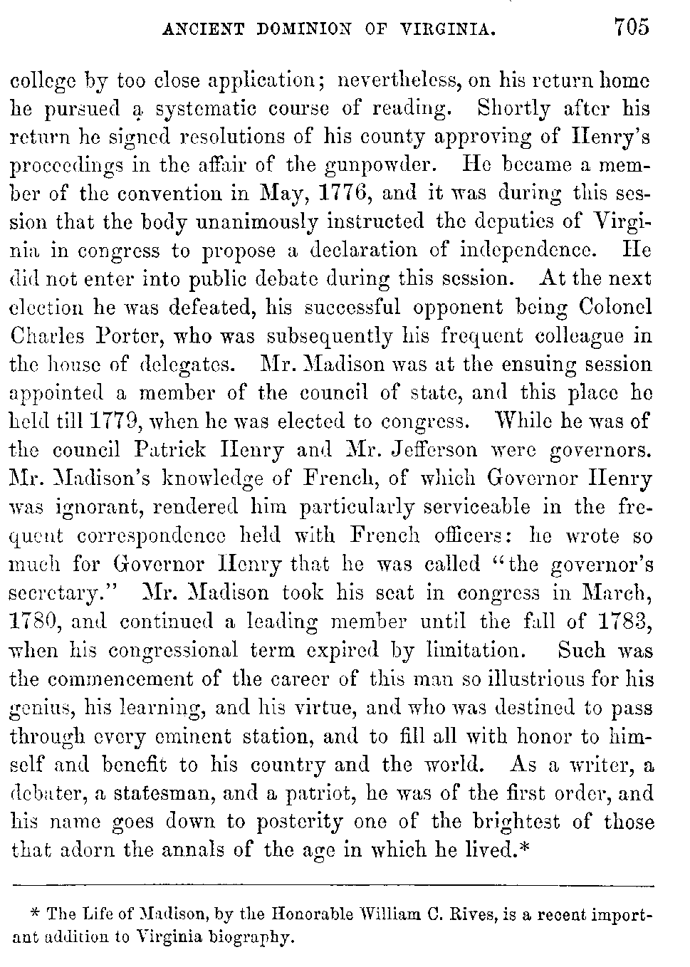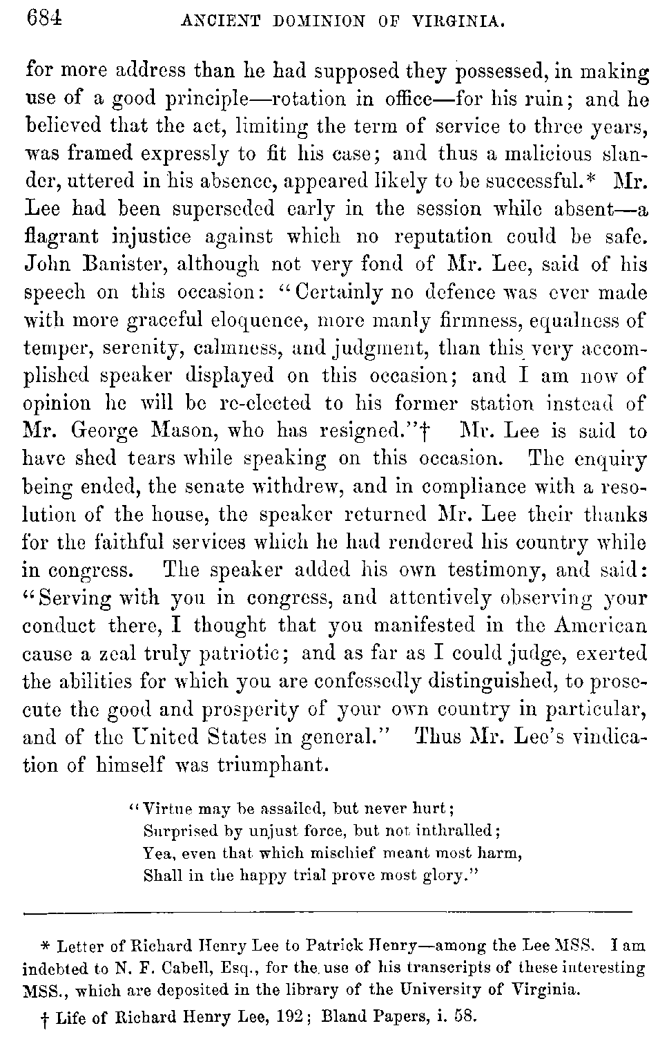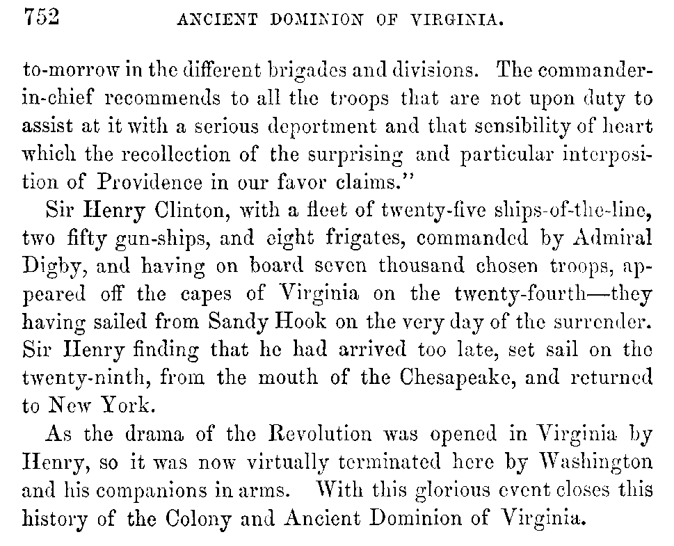 As the drama of the Revolution was opened in Virginia by Henry, so it was now virtually terminated here by Washington and his companions in arms. With this glorious event closes this history of the Colony and Ancient Dominion of Virginia.
