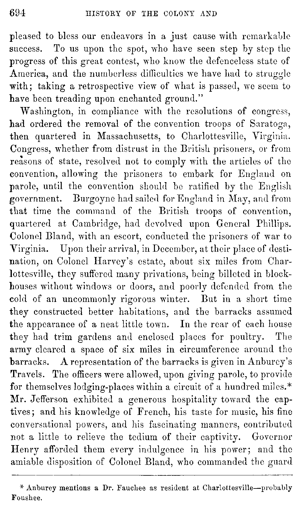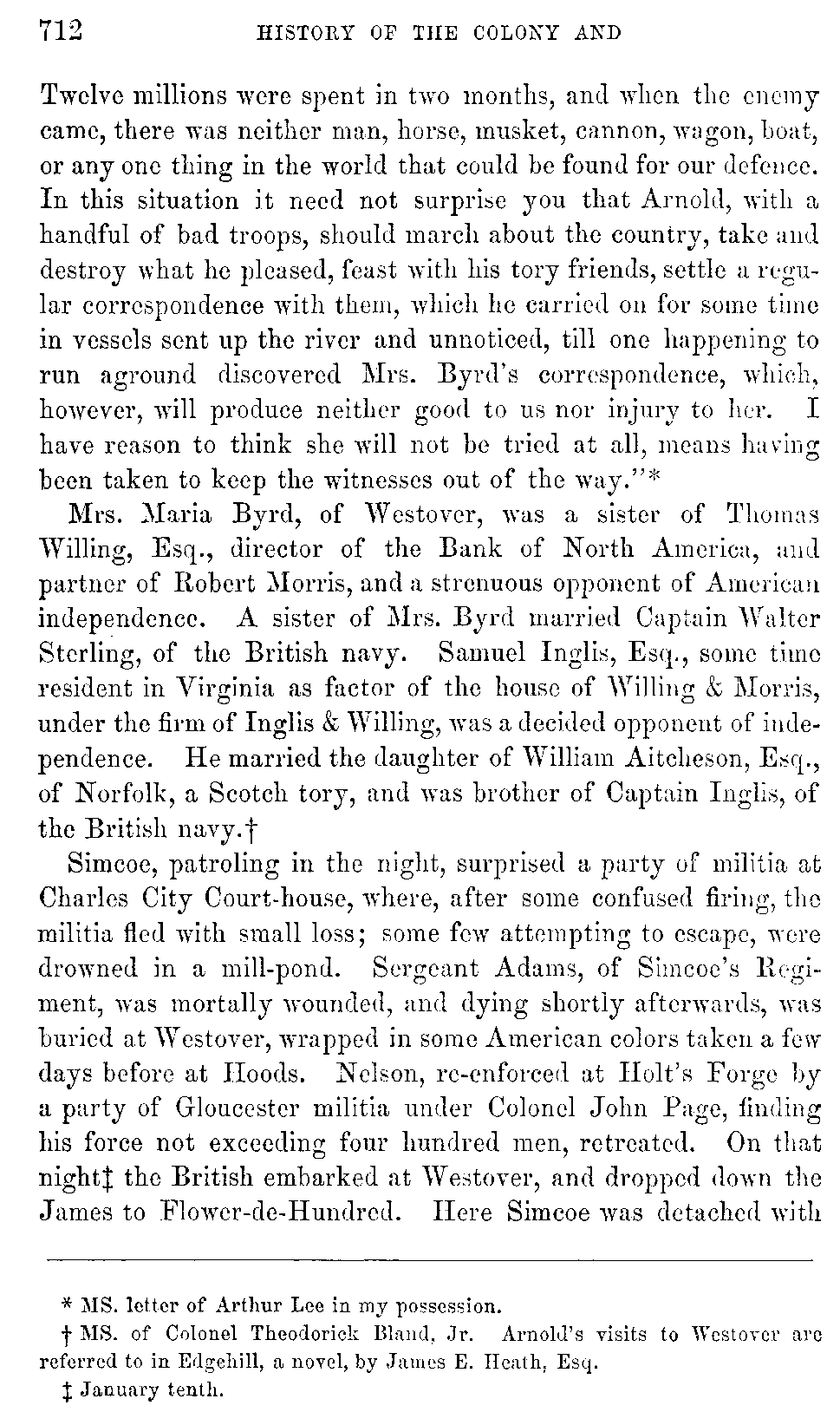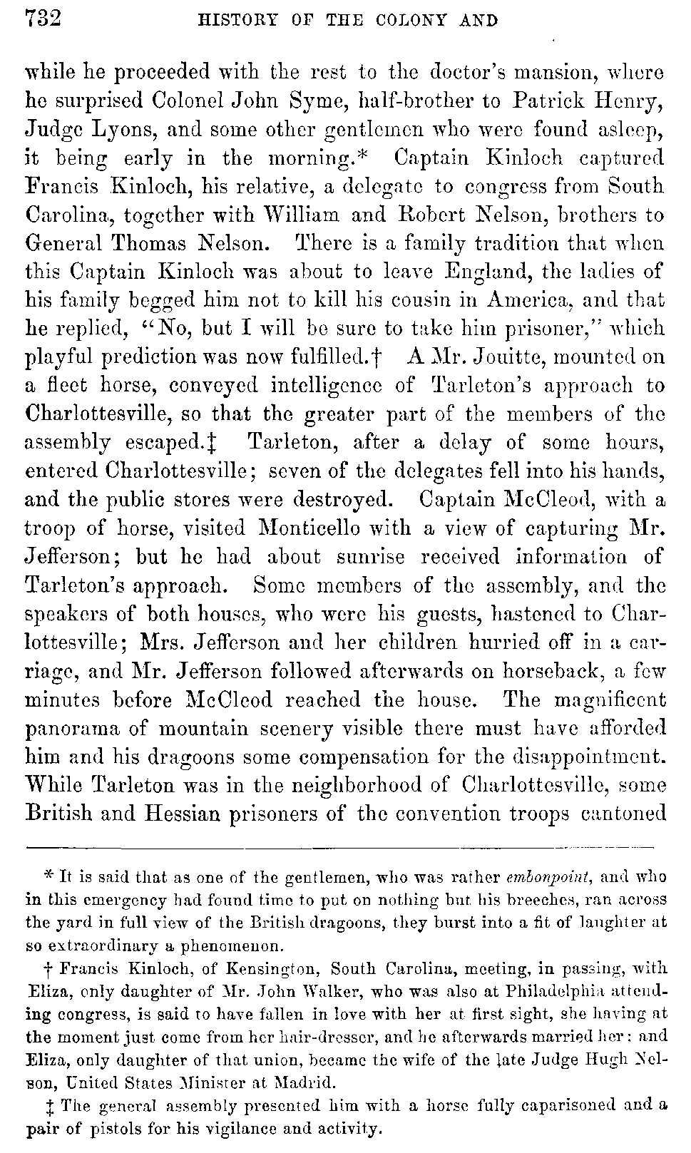 Mean while Tarleton, passing rapidly along the road by Louisa Court-house, met with some wagons laden with clothing for the Southern army, and burnt them. Learning that a number of gentlemen, who had escaped from the lower country, were assembled, some at Dr. Walker's, the others at Mr. John Walker's,[731:A] Tarleton, instead of advancing at once upon Charlottesville, despatched Captain Kinloch with a party to Mr. John Walker's, [732]while he proceeded with the rest to the doctor's mansion, where he surprised Colonel John Syme, half-brother to Patrick Henry, Judge Lyons, and some other gentlemen who were found asleep, it being early in the morning.[732:A] Captain Kinloch captured Francis Kinloch, his relative, a delegate to congress from South Carolina, together with William and Robert Nelson, brothers to General Thomas Nelson. There is a family tradition that when this Captain Kinloch was about to leave England, the ladies of his family begged him not to kill his cousin in America, and that he replied, "No, but I will be sure to take him prisoner," which playful prediction was now fulfilled.[732:B] A Mr. Jouitte, mounted on a fleet horse, conveyed intelligence of Tarleton's approach to Charlottesville, so that the greater part of the members of the assembly escaped.[732:C] Tarleton, after a delay of some hours, entered Charlottesville; seven of the delegates fell into his hands, and the public stores were destroyed. Captain McCleod, with a troop of horse, visited Monticello with a view of capturing Mr. Jefferson; but he had about sunrise received information of Tarleton's approach. Some members of the assembly, and the speakers of both houses, who were his guests, hastened to Charlottesville; Mrs. Jefferson and her children hurried off in a carriage, and Mr. Jefferson followed afterwards on horseback, a few minutes before McCleod reached the house. The magnificent panorama of mountain scenery visible there must have afforded him and his dragoons some compensation for the disappointment. While Tarleton was in the neighborhood of Charlottesville, some British and Hessian prisoners of the convention troops cantoned [733]with the planters, joined him. The prisoners of distinction, whom he had captured, were treated with lenity, being detained only a few days on their parole not to escape; "the lower class were secured as prisoners of war." The prisoners of note were released at Elkhill, a plantation of Mr. Jefferson's, where Cornwallis for ten days made his headquarters. This plantation was laid waste by the enemy. Wherever his lordship's army went, plantations were despoiled, and private houses plundered. During the six months of his stay in Virginia she lost thirty thousand slaves, of whom the greater part died of small-pox and camp fever; and the rest were shipped to the West Indies, Nova Scotia, etc. The devastations committed during these six months were estimated at upwards of thirteen millions of dollars.[733:A]