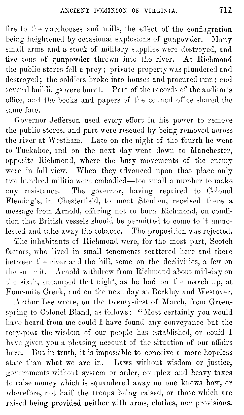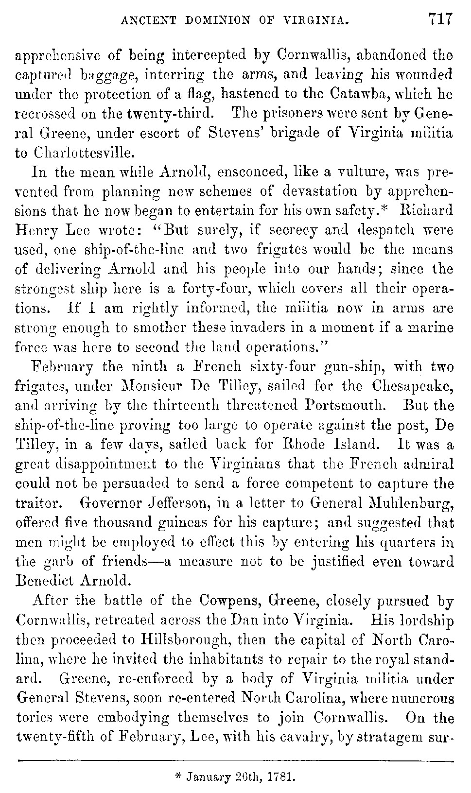 The condition of affairs in Virginia in the summer of 1781 was gloomy, humiliating, apparently almost desperate. After a war of five years the State was still unfortified, unarmed, unprepared. But it was asked, did not every Virginian possess a gun of some kind, and was it not with such arms that the battles of Bunker Hill and of the Cowpens were fought? Virginia had entered upon the war when she was already loaded with debt, and exhausted by her Indian war, and by her non-importation policy, before the war began. Intersected by rivers, she was everywhere exposed to the inroads of the enemy; and a dense slave population obstructed the prompt movement of the militia. The darkness of the future was relieved by a single ray of hope derived from the uncertain rumors of the sailing of a French fleet for America; but frequent disappointment rendered hope of help from that quarter precarious. The bulk of the people were staunch whigs and well affected to the French alliance; but they were growing despondent, and some were even beginning to fear that France was prolonging the war so as to weaken America as well as Great Britain, and to render the new confederation dependent upon its allies. With the aid of a superior French fleet there could be no doubt of the successful issue of the war; without [735]that aid, there was too much reason to fear that the people could not be kept much longer firm, in so unequal a contest.