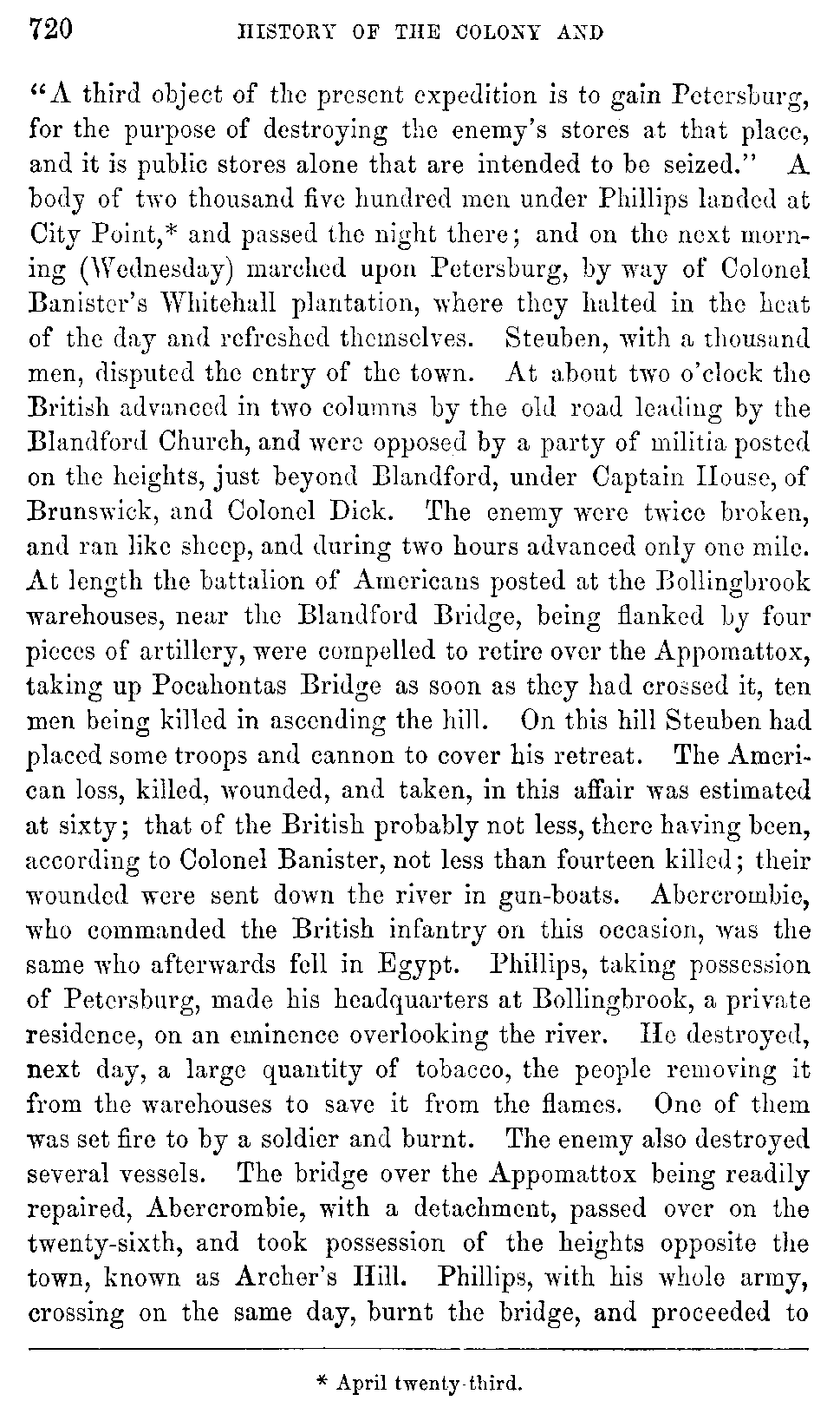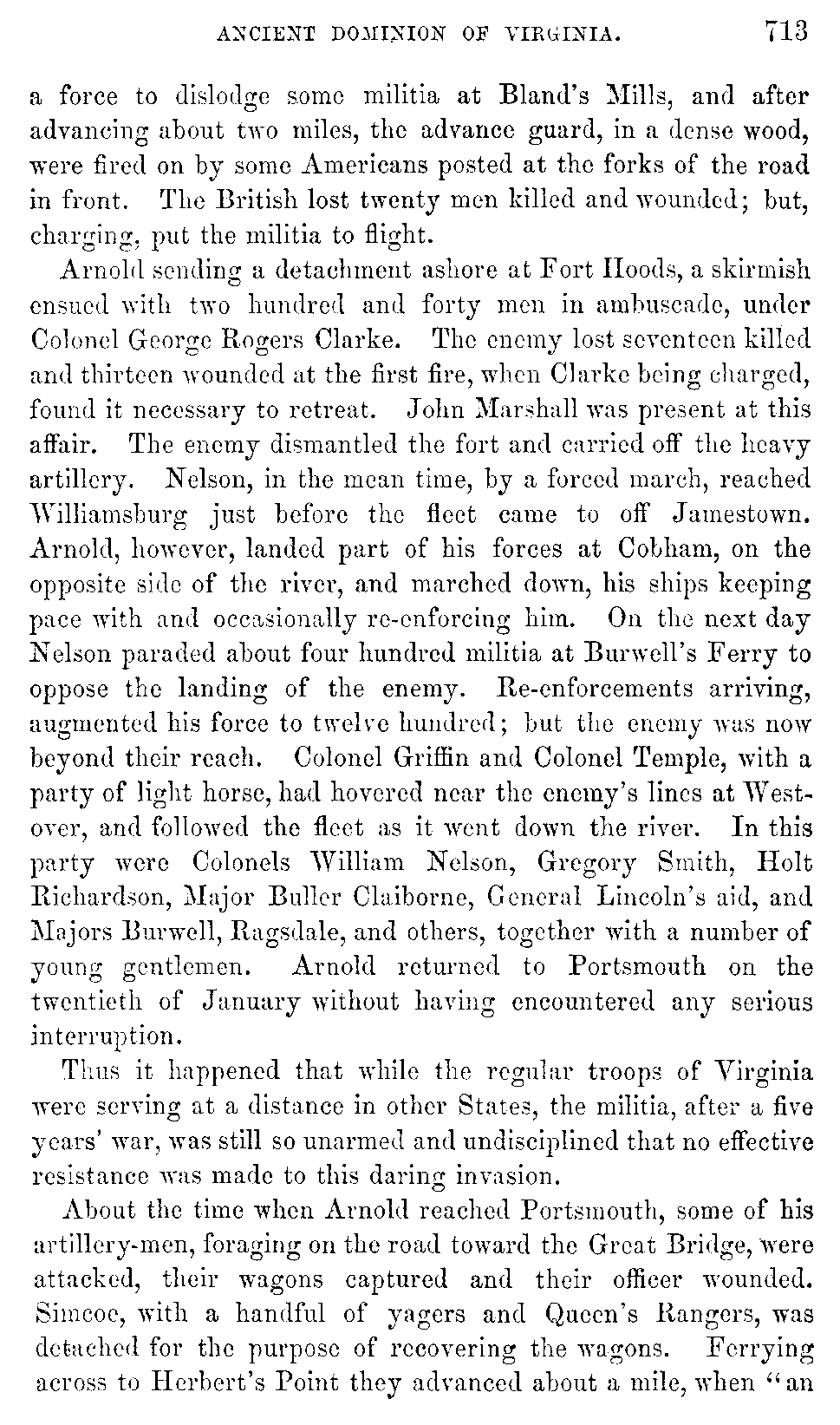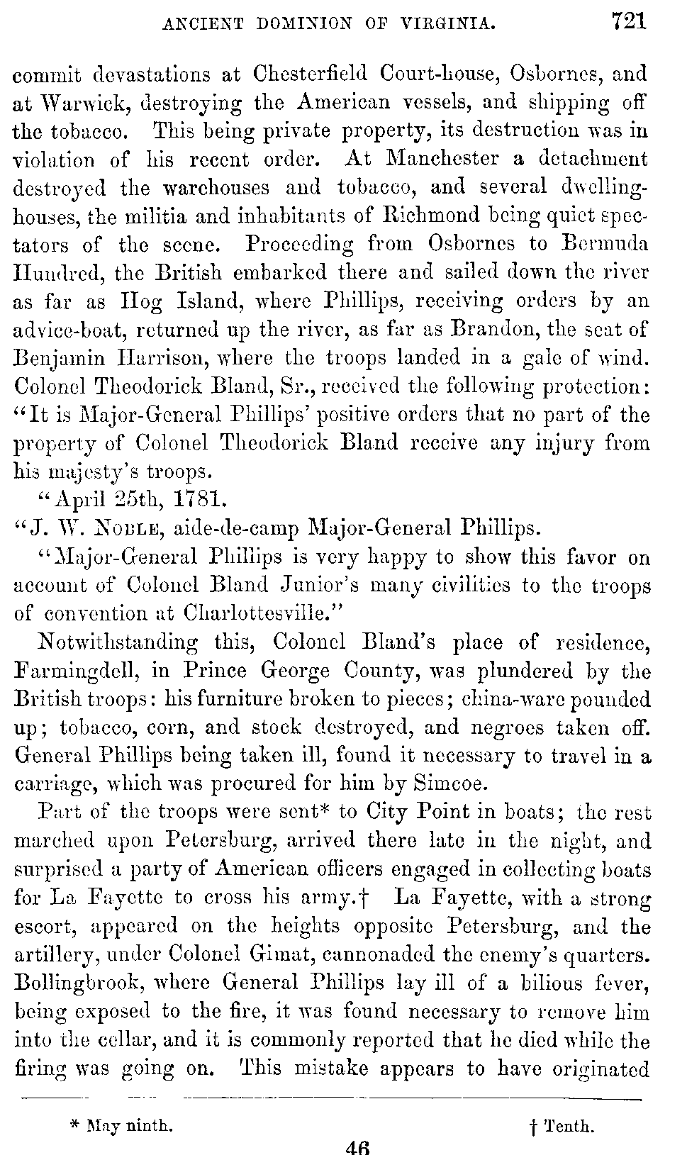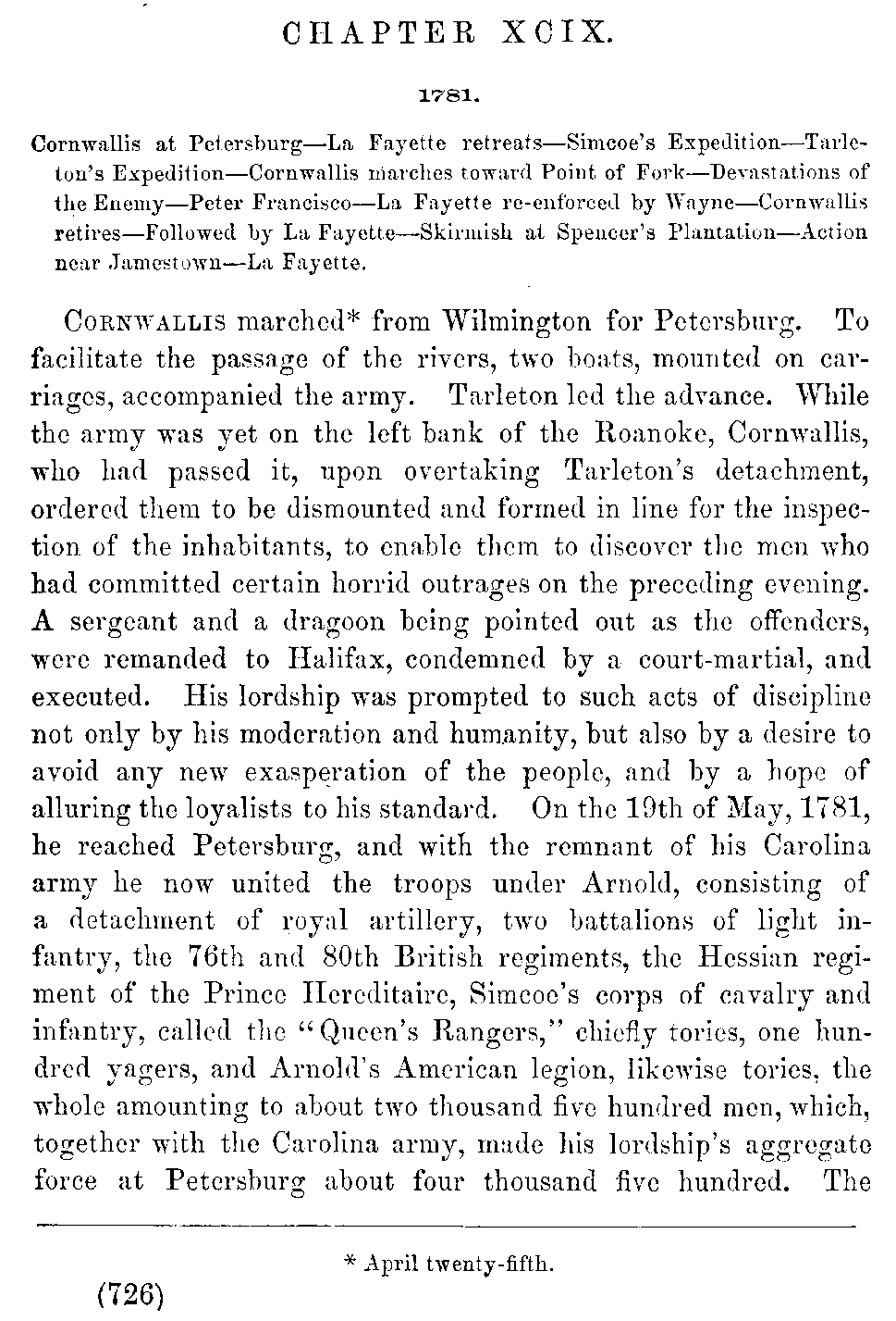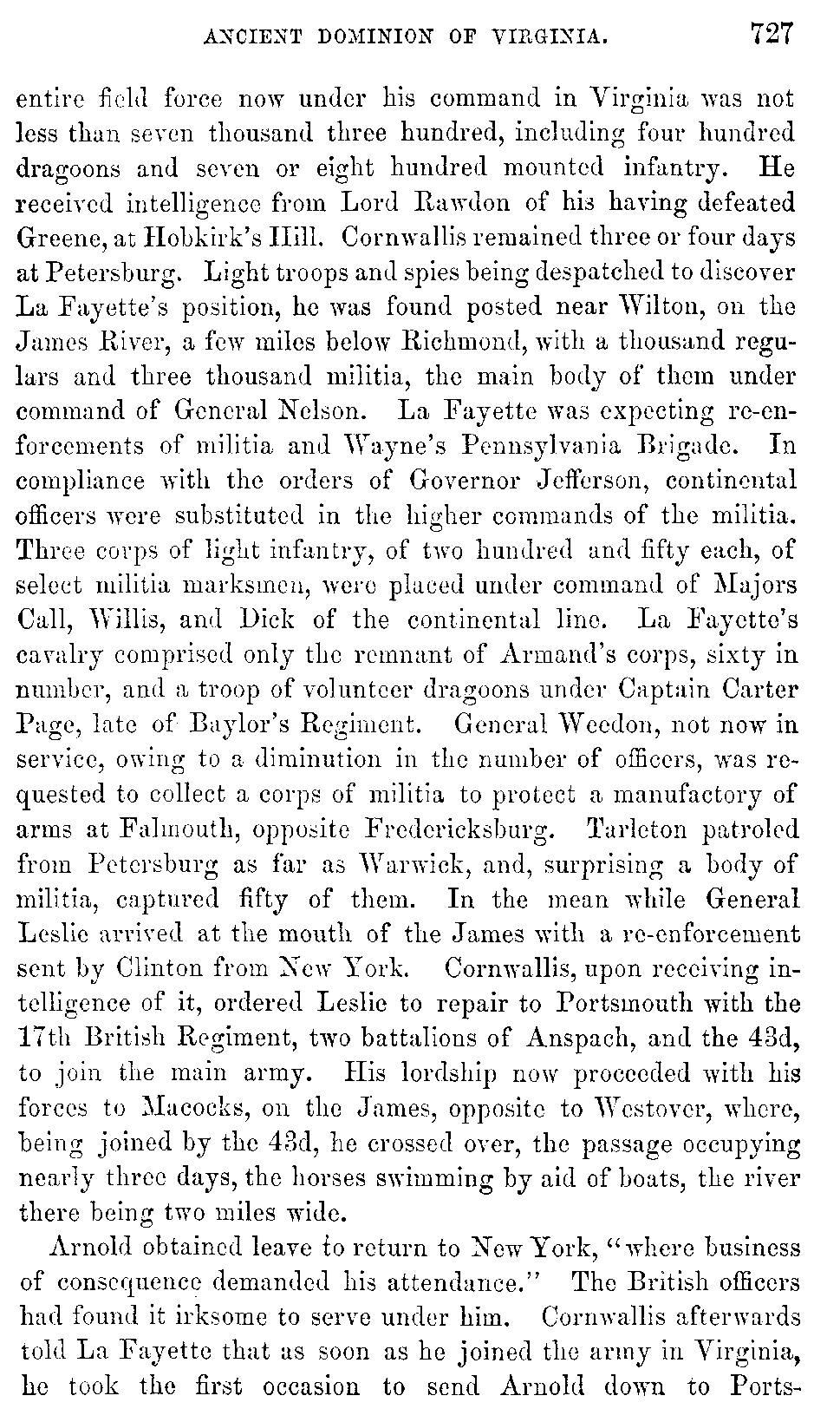 Cornwallis marched[726:A] from Wilmington for Petersburg. To facilitate the passage of the rivers, two boats, mounted on carriages, accompanied the army. Tarleton led the advance. While the army was yet on the left bank of the Roanoke, Cornwallis, who had passed it, upon overtaking Tarleton's detachment, ordered them to be dismounted and formed in line for the inspection of the inhabitants, to enable them to discover the men who had committed certain horrid outrages on the preceding evening. A sergeant and a dragoon being pointed out as the offenders, were remanded to Halifax, condemned by a court-martial, and executed. His lordship was prompted to such acts of discipline not only by his moderation and humanity, but also by a desire to avoid any new exasperation of the people, and by a hope of alluring the loyalists to his standard. On the 19th of May, 1781, he reached Petersburg, and with the remnant of his Carolina army he now united the troops under Arnold, consisting of a detachment of royal artillery, two battalions of light infantry, the 76th and 80th British regiments, the Hessian regiment of the Prince Hereditaire, Simcoe's corps of cavalry and infantry, called the "Queen's Rangers," chiefly tories, one hundred yagers, and Arnold's American legion, likewise tories, the whole amounting to about two thousand five hundred men, which, together with the Carolina army, made his lordship's aggregate force at Petersburg about four thousand five hundred. The [727]entire field force now under his command in Virginia was not less than seven thousand three hundred, including four hundred dragoons and seven or eight hundred mounted infantry. He received intelligence from Lord Rawdon of his having defeated Greene, at Hobkirk's Hill. Cornwallis remained three or four days at Petersburg. Light troops and spies being despatched to discover La Fayette's position, he was found posted near Wilton, on the James River, a few miles below Richmond, with a thousand regulars and three thousand militia, the main body of them under command of General Nelson. La Fayette was expecting re-enforcements of militia and Wayne's Pennsylvania Brigade. In compliance with the orders of Governor Jefferson, continental officers were substituted in the higher commands of the militia. Three corps of light infantry, of two hundred and fifty each, of select militia marksmen, were placed under command of Majors Call, Willis, and Dick of the continental line. La Fayette's cavalry comprised only the remnant of Armand's corps, sixty in number, and a troop of volunteer dragoons under Captain Carter Page, late of Baylor's Regiment. General Weedon, not now in service, owing to a diminution in the number of officers, was requested to collect a corps of militia to protect a manufactory of arms at Falmouth, opposite Fredericksburg. Tarleton patroled from Petersburg as far as Warwick, and, surprising a body of militia, captured fifty of them. In the mean while General Leslie arrived at the mouth of the James with a re-enforcement sent by Clinton from New York. Cornwallis, upon receiving intelligence of it, ordered Leslie to repair to Portsmouth with the 17th British Regiment, two battalions of Anspach, and the 43d, to join the main army. His lordship now proceeded with his forces to Macocks, on the James, opposite to Westover, where, being joined by the 43d, he crossed over, the passage occupying nearly three days, the horses swimming by aid of boats, the river there being two miles wide.