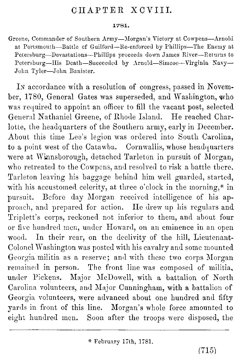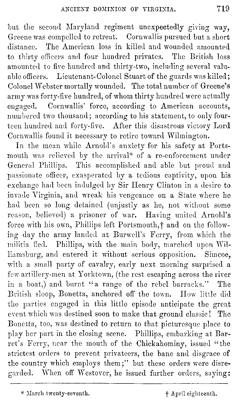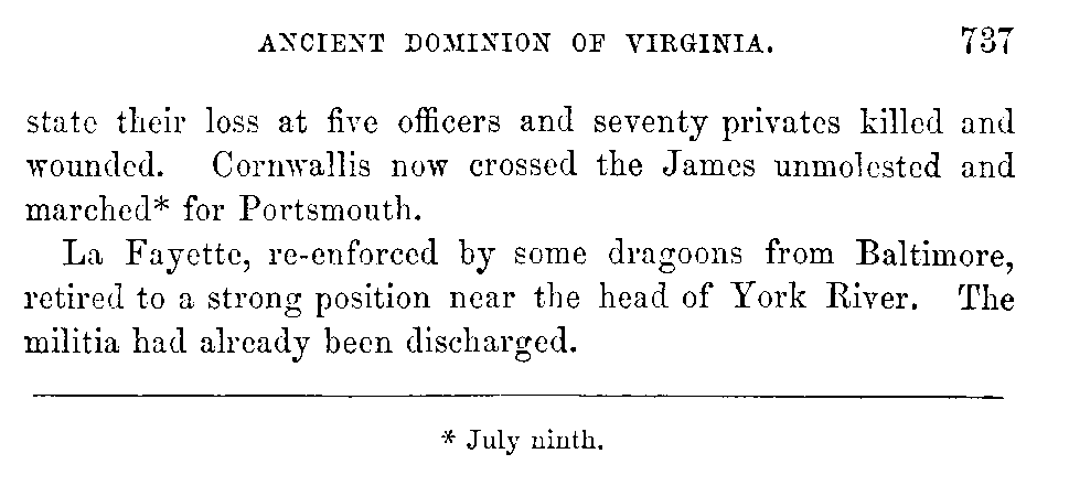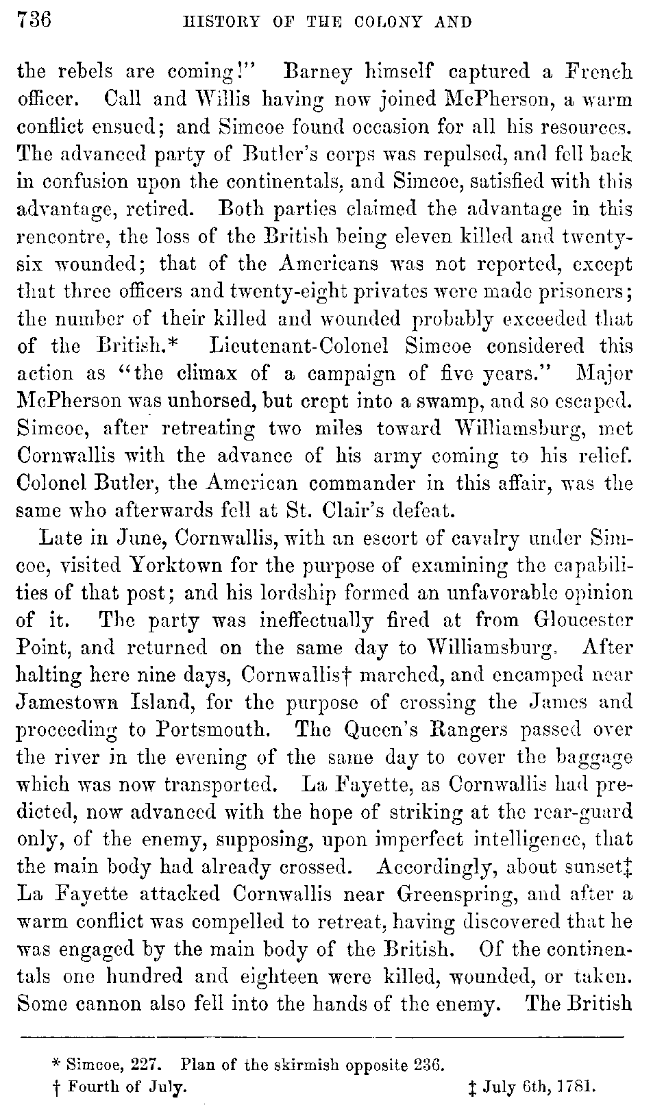 Late in June, Cornwallis, with an escort of cavalry under Simcoe, visited Yorktown for the purpose of examining the capabilities of that post; and his lordship formed an unfavorable opinion of it. The party was ineffectually fired at from Gloucester Point, and returned on the same day to Williamsburg. After halting here nine days, Cornwallis[736:B] marched, and encamped near Jamestown Island, for the purpose of crossing the James and proceeding to Portsmouth. The Queen's Rangers passed over the river in the evening of the same day to cover the baggage which was now transported. La Fayette, as Cornwallis had predicted, now advanced with the hope of striking at the rear-guard only, of the enemy, supposing, upon imperfect intelligence, that the main body had already crossed. Accordingly, about sunset[736:C] La Fayette attacked Cornwallis near Greenspring, and after a warm conflict was compelled to retreat, having discovered that he was engaged by the main body of the British. Of the continentals one hundred and eighteen were killed, wounded, or taken. Some cannon also fell into the hands of the enemy. The British [737]state their loss at five officers and seventy privates killed and wounded. Cornwallis now crossed the James unmolested and marched[737:A] for Portsmouth.