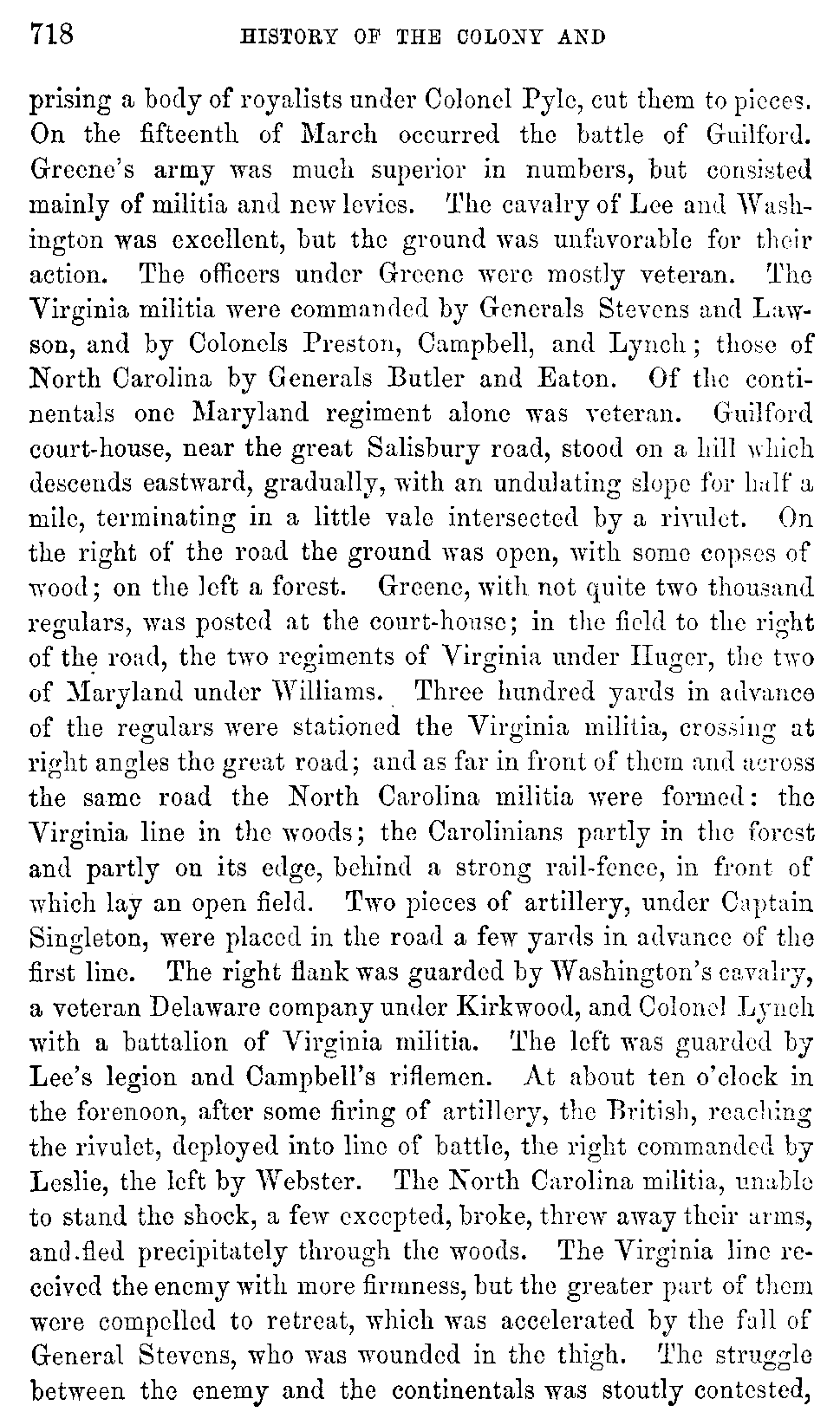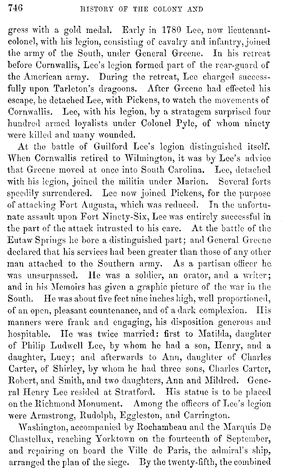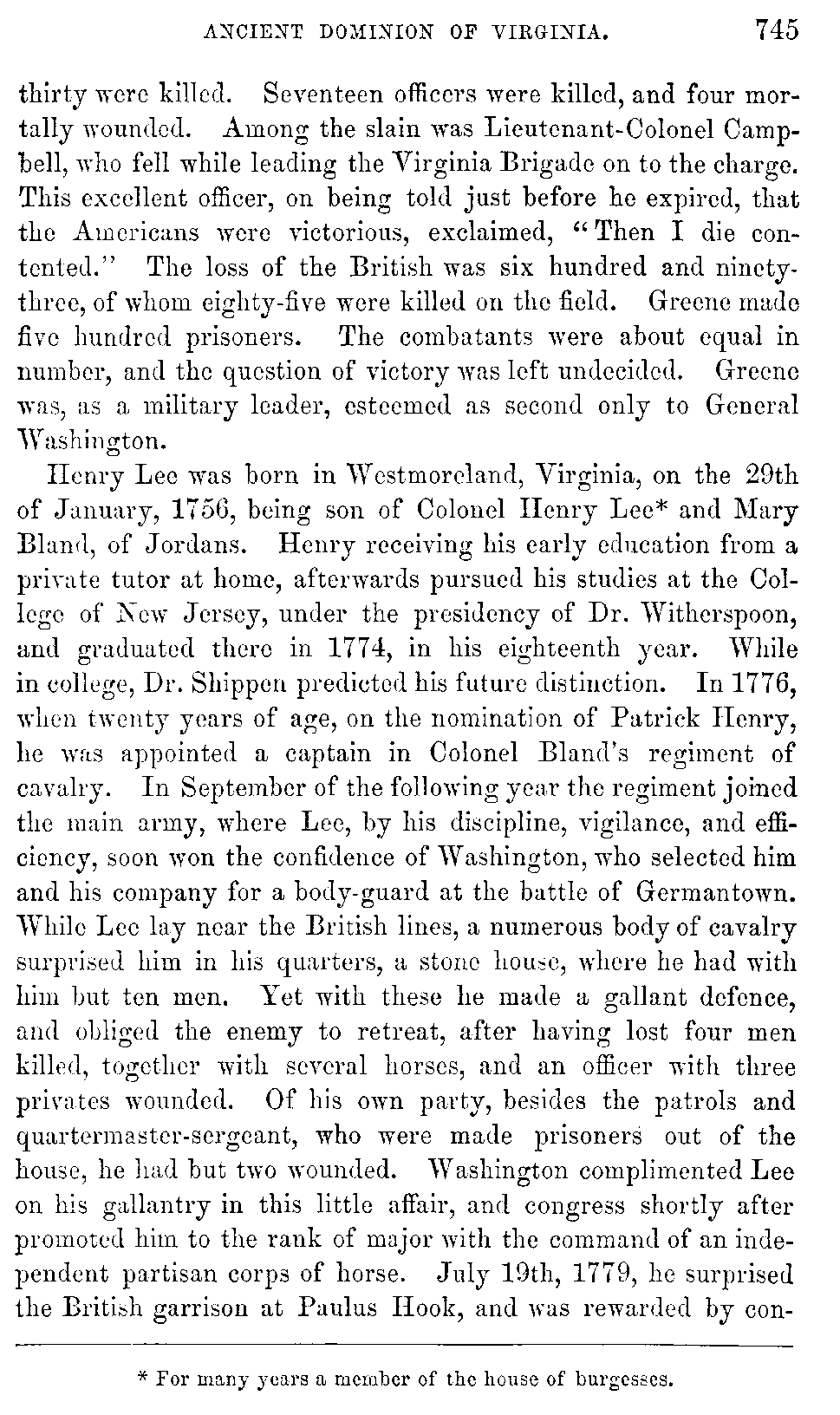 Henry Lee was born in Westmoreland, Virginia, on the 29th of January, 1756, being son of Colonel Henry Lee[745:A] and Mary Bland, of Jordans. Henry receiving his early education from a private tutor at home, afterwards pursued his studies at the College of New Jersey, under the presidency of Dr. Witherspoon, and graduated there in 1774, in his eighteenth year. While in college, Dr. Shippen predicted his future distinction. In 1776, when twenty years of age, on the nomination of Patrick Henry, he was appointed a captain in Colonel Bland's regiment of cavalry. In September of the following year the regiment joined the main army, where Lee, by his discipline, vigilance, and efficiency, soon won the confidence of Washington, who selected him and his company for a body-guard at the battle of Germantown. While Lee lay near the British lines, a numerous body of cavalry surprised him in his quarters, a stone house, where he had with him but ten men. Yet with these he made a gallant defence, and obliged the enemy to retreat, after having lost four men killed, together with several horses, and an officer with three privates wounded. Of his own party, besides the patrols and quartermaster-sergeant, who were made prisoners out of the house, he had but two wounded. Washington complimented Lee on his gallantry in this little affair, and congress shortly after promoted him to the rank of major with the command of an independent partisan corps of horse. July 19th, 1779, he surprised the British garrison at Paulus Hook, and was rewarded by [746]congress with a gold medal. Early in 1780 Lee, now lieutenant-colonel, with his legion, consisting of cavalry and infantry, joined the army of the South, under General Greene. In his retreat before Cornwallis, Lee's legion formed part of the rear-guard of the American army. During the retreat, Lee charged successfully upon Tarleton's dragoons. After Greene had effected his escape, he detached Lee, with Pickens, to watch the movements of Cornwallis. Lee, with his legion, by a stratagem surprised four hundred armed loyalists under Colonel Pyle, of whom ninety were killed and many wounded.
