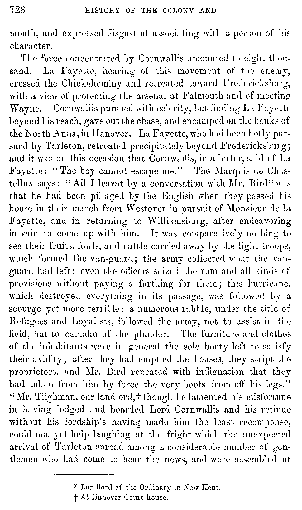 The force concentrated by Cornwallis amounted to eight thousand. La Fayette, hearing of this movement of the enemy, crossed the Chickahominy and retreated toward Fredericksburg, with a view of protecting the arsenal at Falmouth and of meeting Wayne. Cornwallis pursued with celerity, but finding La Fayette beyond his reach, gave out the chase, and encamped on the banks of the North Anna, in Hanover. La Fayette, who had been hotly pursued by Tarleton, retreated precipitately beyond Fredericksburg; and it was on this occasion that Cornwallis, in a letter, said of La Fayette: "The boy cannot escape me." The Marquis de Chastellux says: "All I learnt by a conversation with Mr. Bird[728:A] was that he had been pillaged by the English when they passed his house in their march from Westover in pursuit of Monsieur de la Fayette, and in returning to Williamsburg, after endeavoring in vain to come up with him. It was comparatively nothing to see their fruits, fowls, and cattle carried away by the light troops, which formed the van-guard; the army collected what the van-guard had left; even the officers seized the rum and all kinds of provisions without paying a farthing for them; this hurricane, which destroyed everything in its passage, was followed by a scourge yet more terrible: a numerous rabble, under the title of Refugees and Loyalists, followed the army, not to assist in the field, but to partake of the plunder. The furniture and clothes of the inhabitants were in general the sole booty left to satisfy their avidity; after they had emptied the houses, they stript the proprietors, and Mr. Bird repeated with indignation that they had taken from him by force the very boots from off his legs." "Mr. Tilghman, our landlord,[728:B] though he lamented his misfortune in having lodged and boarded Lord Cornwallis and his retinue without his lordship's having made him the least recompense, could not yet help laughing at the fright which the unexpected arrival of Tarleton spread among a considerable number of gentlemen who had come to hear the news, and were assembled at [729]the court-house. A negro on horseback came full gallop to let them know that Tarleton was not above three miles off. The resolution of retreating was soon taken; but the alarm was so sudden and the confusion so great that every one mounted the first horse he could find, so that few of those curious gentlemen returned upon their own horses."