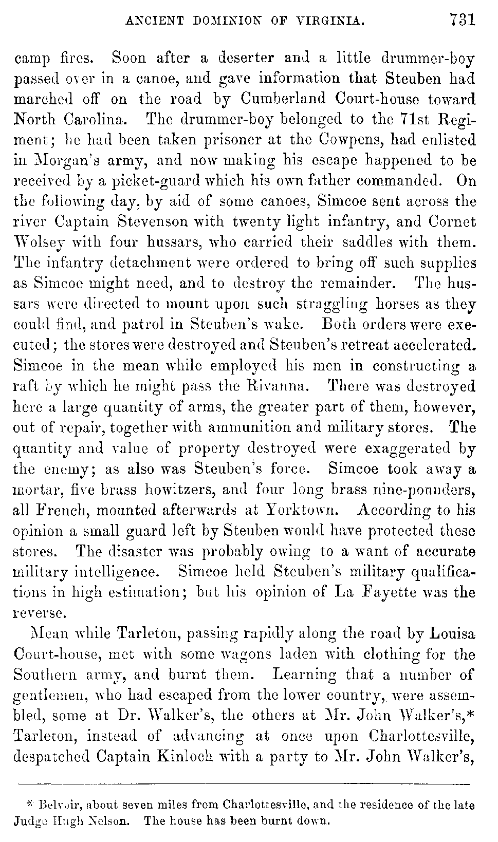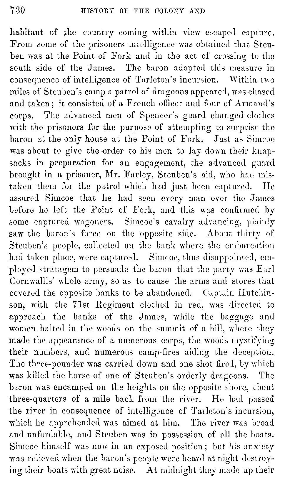 Lieutenant Spencer, with twenty hussars, formed Simcoe's advanced guard of chosen men mounted on fleet horses. Simcoe crossing the South Anna, pushed on with his usual rapidity by Bird's Ordinary toward Napier's Ford on the Rivanna. Cornwallis, with the main body, followed in Simcoe's route. No [730]inhabitant of the country coming within view escaped capture. From some of the prisoners intelligence was obtained that Steuben was at the Point of Fork and in the act of crossing to the south side of the James. The baron adopted this measure in consequence of intelligence of Tarleton's incursion. Within two miles of Steuben's camp a patrol of dragoons appeared, was chased and taken; it consisted of a French officer and four of Armand's corps. The advanced men of Spencer's guard changed clothes with the prisoners for the purpose of attempting to surprise the baron at the only house at the Point of Fork. Just as Simcoe was about to give the order to his men to lay down their knapsacks in preparation for an engagement, the advanced guard brought in a prisoner, Mr. Farley, Steuben's aid, who had mistaken them for the patrol which had just been captured. He assured Simcoe that he had seen every man over the James before he left the Point of Fork, and this was confirmed by some captured wagoners. Simcoe's cavalry advancing, plainly saw the baron's force on the opposite side. About thirty of Steuben's people, collected on the bank where the embarcation had taken place, were captured. Simcoe, thus disappointed, employed stratagem to persuade the baron that the party was Earl Cornwallis' whole army, so as to cause the arms and stores that covered the opposite banks to be abandoned. Captain Hutchinson, with the 71st Regiment clothed in red, was directed to approach the banks of the James, while the baggage and women halted in the woods on the summit of a hill, where they made the appearance of a numerous corps, the woods mystifying their numbers, and numerous camp-fires aiding the deception. The three-pounder was carried down and one shot fired, by which was killed the horse of one of Steuben's orderly dragoons. The baron was encamped on the heights on the opposite shore, about three-quarters of a mile back from the river. He had passed the river in consequence of intelligence of Tarleton's incursion, which he apprehended was aimed at him. The river was broad and unfordable, and Steuben was in possession of all the boats. Simcoe himself was now in an exposed position; but his anxiety was relieved when the baron's people were heard at night destroying their boats with great noise. At midnight they made up their [731]camp fires. Soon after a deserter and a little drummer-boy passed over in a canoe, and gave information that Steuben had marched off on the road by Cumberland Court-house toward North Carolina. The drummer-boy belonged to the 71st Regiment; he had been taken prisoner at the Cowpens, had enlisted in Morgan's army, and now making his escape happened to be received by a picket-guard which his own father commanded. On the following day, by aid of some canoes, Simcoe sent across the river Captain Stevenson with twenty light infantry, and Cornet Wolsey with four hussars, who carried their saddles with them. The infantry detachment were ordered to bring off such supplies as Simcoe might need, and to destroy the remainder. The hussars were directed to mount upon such straggling horses as they could find, and patrol in Steuben's wake. Both orders were executed; the stores were destroyed and Steuben's retreat accelerated. Simcoe in the mean while employed his men in constructing a raft by which he might pass the Rivanna. There was destroyed here a large quantity of arms, the greater part of them, however, out of repair, together with ammunition and military stores. The quantity and value of property destroyed were exaggerated by the enemy; as also was Steuben's force. Simcoe took away a mortar, five brass howitzers, and four long brass nine-pounders, all French, mounted afterwards at Yorktown. According to his opinion a small guard left by Steuben would have protected these stores. The disaster was probably owing to a want of accurate military intelligence. Simcoe held Steuben's military qualifications in high estimation; but his opinion of La Fayette was the reverse.