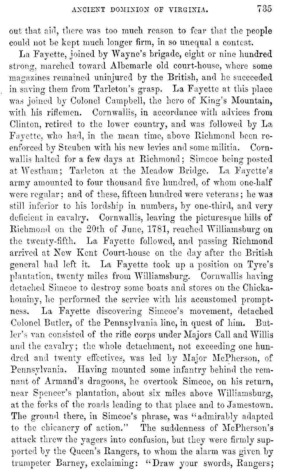 La Fayette, joined by Wayne's brigade, eight or nine hundred strong, marched toward Albemarle old court-house, where some magazines remained uninjured by the British, and he succeeded in saving them from Tarleton's grasp. La Fayette at this place was joined by Colonel Campbell, the hero of King's Mountain, with his riflemen. Cornwallis, in accordance with advices from Clinton, retired to the lower country, and was followed by La Fayette, who had, in the mean time, above Richmond been re-enforced by Steuben with his new levies and some militia. Cornwallis halted for a few days at Richmond; Simcoe being posted at Westham; Tarleton at the Meadow Bridge. La Fayette's army amounted to four thousand five hundred, of whom one-half were regular; and of these, fifteen hundred were veterans; he was still inferior to his lordship in numbers, by one-third, and very deficient in cavalry. Cornwallis, leaving the picturesque hills of Richmond on the 20th of June, 1781, reached Williamsburg on the twenty-fifth. La Fayette followed, and passing Richmond arrived at New Kent Court-house on the day after the British general had left it. La Fayette took up a position on Tyre's plantation, twenty miles from Williamsburg. Cornwallis having detached Simcoe to destroy some boats and stores on the Chickahominy, he performed the service with his accustomed promptness. La Fayette discovering Simcoe's movement, detached Colonel Butler, of the Pennsylvania line, in quest of him. Butler's van consisted of the rifle corps under Majors Call and Willis and the cavalry; the whole detachment, not exceeding one hundred and twenty effectives, was led by Major McPherson, of Pennsylvania. Having mounted some infantry behind the remnant of Armand's dragoons, he overtook Simcoe, on his return, near Spencer's plantation, about six miles above Williamsburg, at the forks of the roads leading to that place and to Jamestown. The ground there, in Simcoe's phrase, was "admirably adapted to the chicanery of action." The suddenness of McPherson's attack threw the yagers into confusion, but they were firmly supported by the Queen's Rangers, to whom the alarm was given by trumpeter Barney, exclaiming: "Draw your swords, Rangers; [736]the rebels are coming!" Barney himself captured a French officer. Call and Willis having now joined McPherson, a warm conflict ensued; and Simcoe found occasion for all his resources. The advanced party of Butler's corps was repulsed, and fell back in confusion upon the continentals, and Simcoe, satisfied with this advantage, retired. Both parties claimed the advantage in this rencontre, the loss of the British being eleven killed and twenty-six wounded; that of the Americans was not reported, except that three officers and twenty-eight privates were made prisoners; the number of their killed and wounded probably exceeded that of the British.[736:A] Lieutenant-Colonel Simcoe considered this action as "the climax of a campaign of five years." Major McPherson was unhorsed, but crept into a swamp, and so escaped. Simcoe, after retreating two miles toward Williamsburg, met Cornwallis with the advance of his army coming to his relief. Colonel Butler, the American commander in this affair, was the same who afterwards fell at St. Clair's defeat.