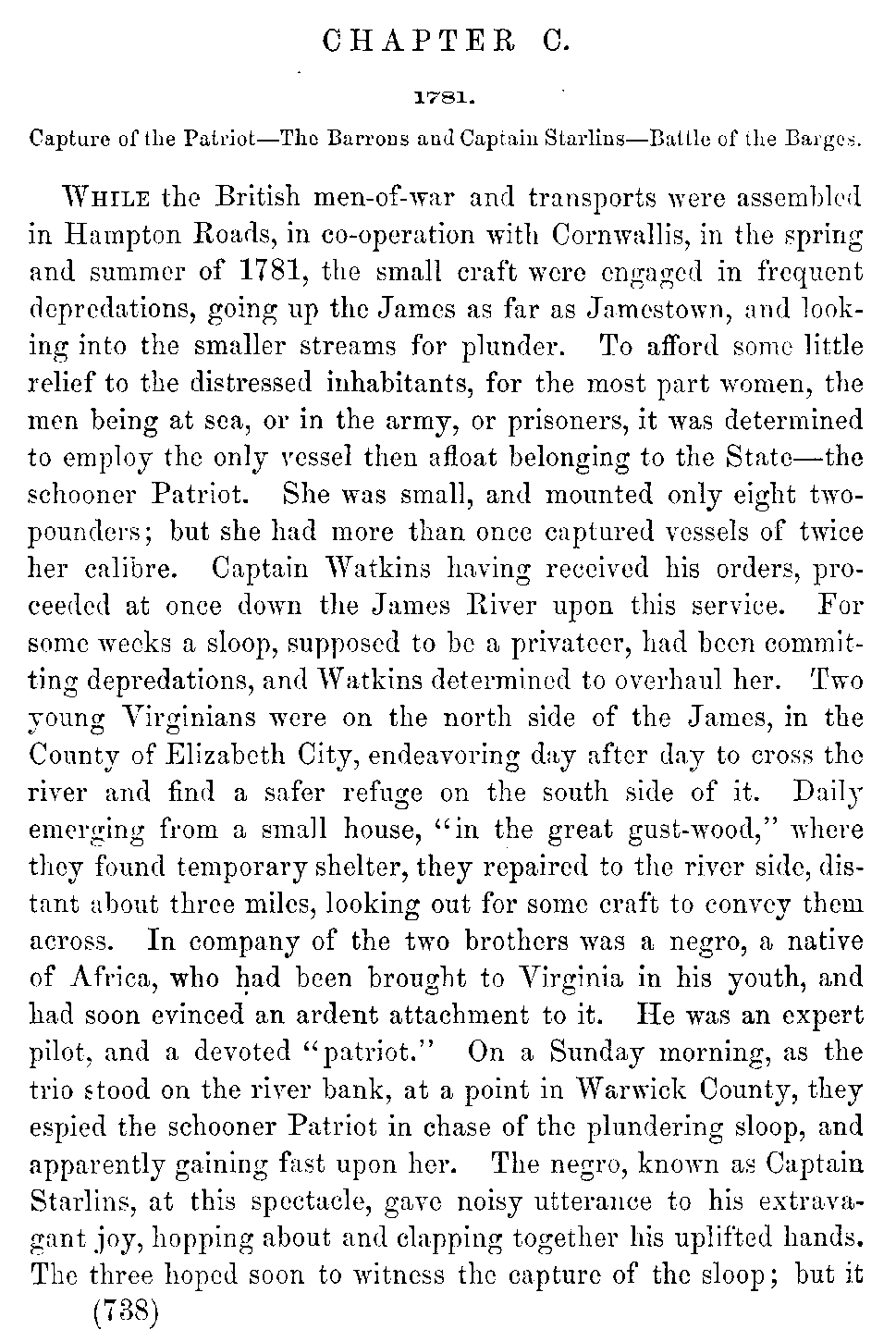 While the British men-of-war and transports were assembled in Hampton Roads, in co-operation with Cornwallis, in the spring and summer of 1781, the small craft were engaged in frequent depredations, going up the James as far as Jamestown, and looking into the smaller streams for plunder. To afford some little relief to the distressed inhabitants, for the most part women, the men being at sea, or in the army, or prisoners, it was determined to employ the only vessel then afloat belonging to the State—the schooner Patriot. She was small, and mounted only eight two-pounders; but she had more than once captured vessels of twice her calibre. Captain Watkins having received his orders, proceeded at once down the James River upon this service. For some weeks a sloop, supposed to be a privateer, had been committing depredations, and Watkins determined to overhaul her. Two young Virginians were on the north side of the James, in the County of Elizabeth City, endeavoring day after day to cross the river and find a safer refuge on the south side of it. Daily emerging from a small house, "in the great gust-wood," where they found temporary shelter, they repaired to the river side, distant about three miles, looking out for some craft to convey them across. In company of the two brothers was a negro, a native of Africa, who had been brought to Virginia in his youth, and had soon evinced an ardent attachment to it. He was an expert pilot, and a devoted "patriot." On a Sunday morning, as the trio stood on the river bank, at a point in Warwick County, they espied the schooner Patriot in chase of the plundering sloop, and apparently gaining fast upon her. The negro, known as Captain Starlins, at this spectacle, gave noisy utterance to his extravagant joy, hopping about and clapping together his uplifted hands. The three hoped soon to witness the capture of the sloop; but it [739]turned out that she was purposely retarded in her course by a drag thrown out over her starboard bow, and the Patriot coming alongside of her, there suddenly up jumped fifty marines, and in a moment the Patriot was captured.[739:A] The three spectators beheld the catastrophe with intense disappointment. From the zenith of hope Captain Starlins had been suddenly plunged souse down to the nadir of despair. He and the younger of the brothers burst into tears, while the older brother, fifteen years of age, although no less grieved, had more command over his sensibilities. Giving a parting look to the unfortunate schooner as she disappeared in the hazy distance, they retraced their steps. Watkins and those under him were sent off to Charleston, and confined in the provost prison, where he died. The Patriot was taken round to Yorktown. Captain Mark Starlins died a slave a few years after, and just before the passage of a law giving freedom to those men of color who had served the patriotic cause. His slavery, however, appears to have been merely nominal; for his master fully appreciated his noble character, and which was held in high estimation by all worthy citizens, especially by all the navy officers of Virginia. The two brothers were the Barrons, afterwards distinguished in the United States naval service.[739:B]