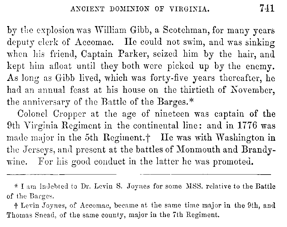 Colonel Cropper at the age of nineteen was captain of the 9th Virginia Regiment in the continental line: and in 1776 was made major in the 5th Regiment.[741:B] He was with Washington in the Jerseys, and present at the battles of Monmouth and Brandywine. For his good conduct in the latter he was promoted.