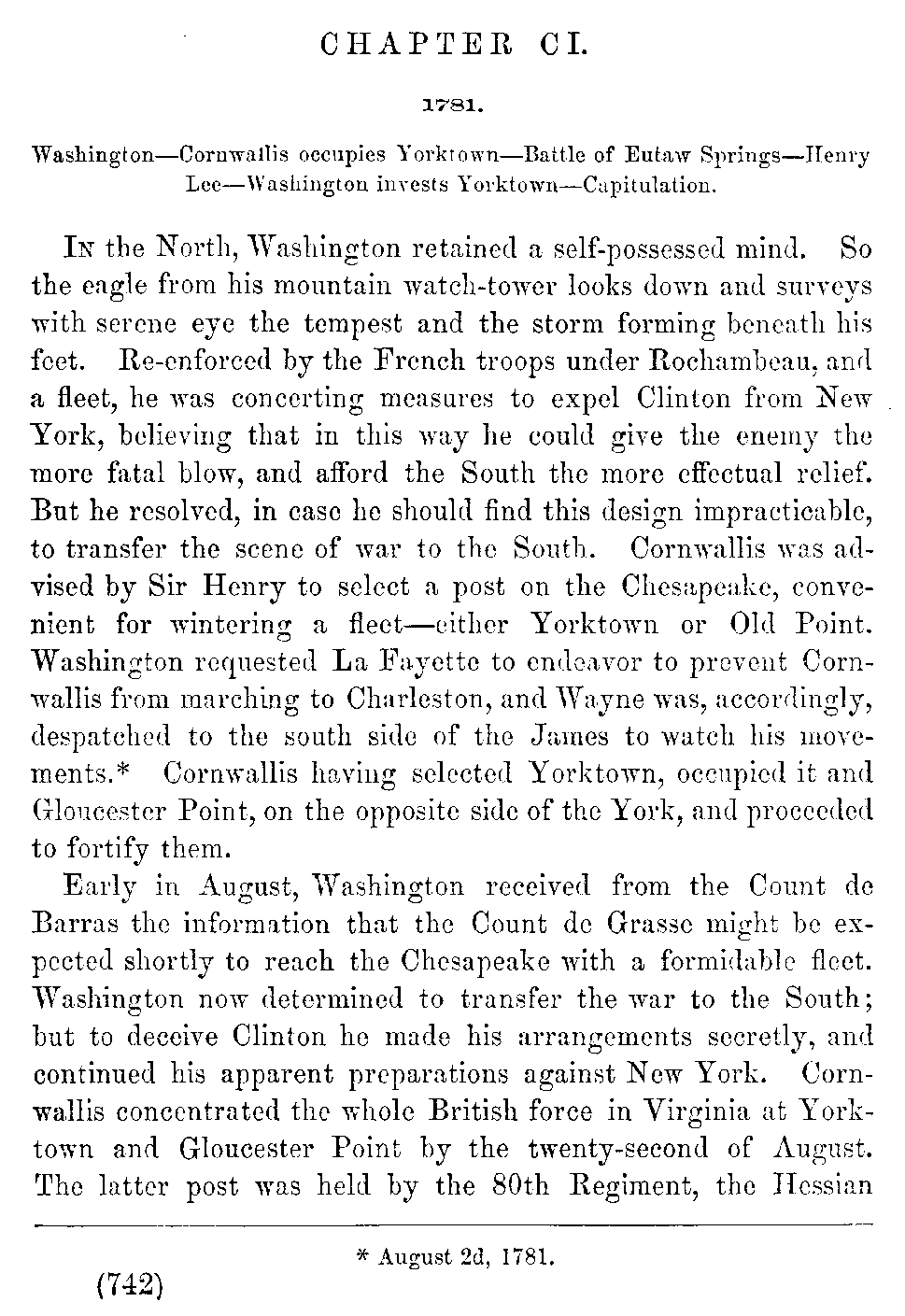 In the North, Washington retained a self-possessed mind. So the eagle from his mountain watch-tower looks down and surveys with serene eye the tempest and the storm forming beneath his feet. Re-enforced by the French troops under Rochambeau, and a fleet, he was concerting measures to expel Clinton from New York, believing that in this way he could give the enemy the more fatal blow, and afford the South the more effectual relief. But he resolved, in case he should find this design impracticable, to transfer the scene of war to the South. Cornwallis was advised by Sir Henry to select a post on the Chesapeake, convenient for wintering a fleet—either Yorktown or Old Point. Washington requested La Fayette to endeavor to prevent Cornwallis from marching to Charleston, and Wayne was, accordingly, despatched to the south side of the James to watch his movements.[742:A] Cornwallis having selected Yorktown, occupied it and Gloucester Point, on the opposite side of the York, and proceeded to fortify them.