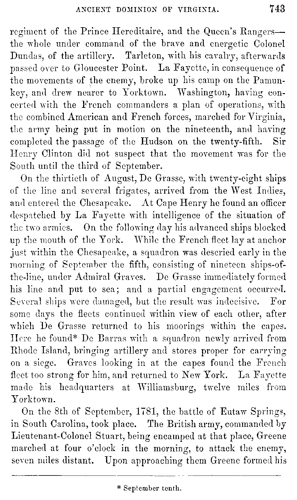 On the thirtieth of August, De Grasse, with twenty-eight ships of the line and several frigates, arrived from the West Indies, and entered the Chesapeake. At Cape Henry he found an officer despatched by La Fayette with intelligence of the situation of the two armies. On the following day his advanced ships blocked up the mouth of the York. While the French fleet lay at anchor just within the Chesapeake, a squadron was descried early in the morning of September the fifth, consisting of nineteen ships-of-the-line, under Admiral Graves. De Grasse immediately formed his line and put to sea; and a partial engagement occurred. Several ships were damaged, but the result was indecisive. For some days the fleets continued within view of each other, after which De Grasse returned to his moorings within the capes. Here he found[743:A] De Barras with a squadron newly arrived from Rhode Island, bringing artillery and stores proper for carrying on a siege. Graves looking in at the capes found the French fleet too strong for him, and returned to New York. La Fayette made his headquarters at Williamsburg, twelve miles from Yorktown.