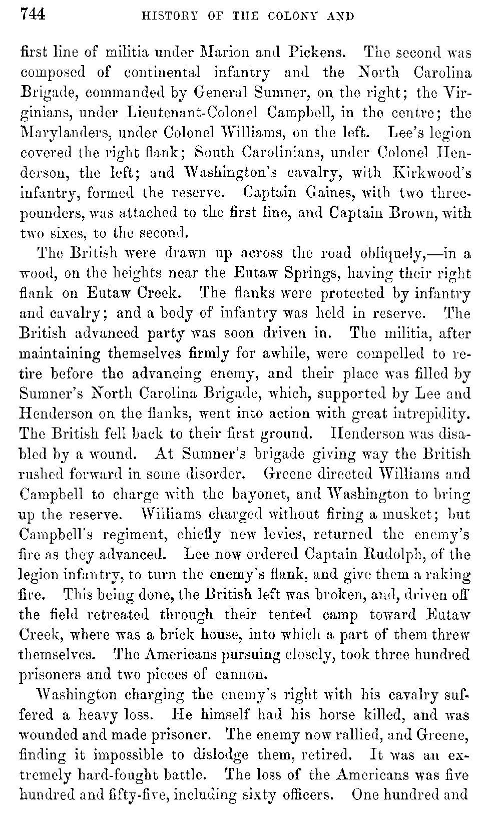 The British were drawn up across the road obliquely,—in a wood, on the heights near the Eutaw Springs, having their right flank on Eutaw Creek. The flanks were protected by infantry and cavalry; and a body of infantry was held in reserve. The British advanced party was soon driven in. The militia, after maintaining themselves firmly for awhile, were compelled to retire before the advancing enemy, and their place was filled by Sumner's North Carolina Brigade, which, supported by Lee and Henderson on the flanks, went into action with great intrepidity. The British fell back to their first ground. Henderson was disabled by a wound. At Sumner's brigade giving way the British rushed forward in some disorder. Greene directed Williams and Campbell to charge with the bayonet, and Washington to bring up the reserve. Williams charged without firing a musket; but Campbell's regiment, chiefly new levies, returned the enemy's fire as they advanced. Lee now ordered Captain Rudolph, of the legion infantry, to turn the enemy's flank, and give them a raking fire. This being done, the British left was broken, and, driven off the field retreated through their tented camp toward Eutaw Creek, where was a brick house, into which a part of them threw themselves. The Americans pursuing closely, took three hundred prisoners and two pieces of cannon.