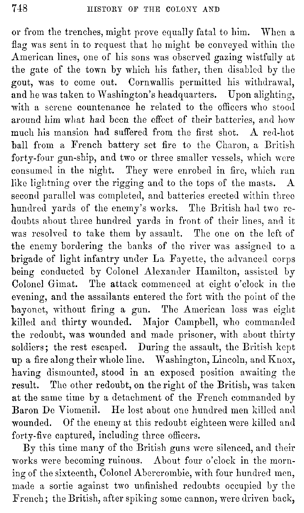 Upon the breaking out of the Revolution, the Secretary had retired from public affairs. He lived at Yorktown, where he had erected a handsome house. Cornwallis made his headquarters in this house, which stood near the defensive works. It soon attracted the attention of the French artillery, and was almost entirely demolished. Secretary Nelson was in it when the first shot killed one of his negroes at a little distance from him. What increased his solicitude was that he had two sons in the American army; so that every shot, whether fired from the town [748]or from the trenches, might prove equally fatal to him. When a flag was sent in to request that he might be conveyed within the American lines, one of his sons was observed gazing wistfully at the gate of the town by which his father, then disabled by the gout, was to come out. Cornwallis permitted his withdrawal, and he was taken to Washington's headquarters. Upon alighting, with a serene countenance he related to the officers who stood around him what had been the effect of their batteries, and how much his mansion had suffered from the first shot. A red-hot ball from a French battery set fire to the Charon, a British forty-four gun-ship, and two or three smaller vessels, which were consumed in the night. They were enrobed in fire, which ran like lightning over the rigging and to the tops of the masts. A second parallel was completed, and batteries erected within three hundred yards of the enemy's works. The British had two redoubts about three hundred yards in front of their lines, and it was resolved to take them by assault. The one on the left of the enemy bordering the banks of the river was assigned to a brigade of light infantry under La Fayette, the advanced corps being conducted by Colonel Alexander Hamilton, assisted by Colonel Gimat. The attack commenced at eight o'clock in the evening, and the assailants entered the fort with the point of the bayonet, without firing a gun. The American loss was eight killed and thirty wounded. Major Campbell, who commanded the redoubt, was wounded and made prisoner, with about thirty soldiers; the rest escaped. During the assault, the British kept up a fire along their whole line. Washington, Lincoln, and Knox, having dismounted, stood in an exposed position awaiting the result. The other redoubt, on the right of the British, was taken at the same time by a detachment of the French commanded by Baron De Viomenil. He lost about one hundred men killed and wounded. Of the enemy at this redoubt eighteen were killed and forty-five captured, including three officers.