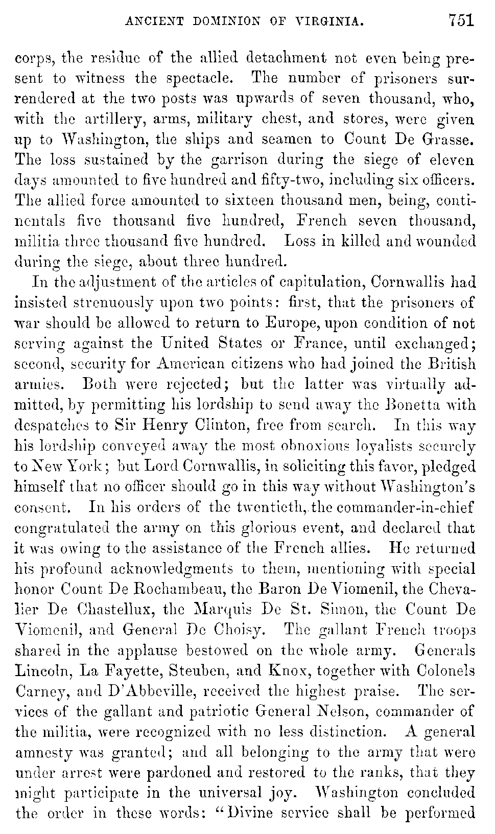 In the adjustment of the articles of capitulation, Cornwallis had insisted strenuously upon two points: first, that the prisoners of war should be allowed to return to Europe, upon condition of not serving against the United States or France, until exchanged; second, security for American citizens who had joined the British armies. Both were rejected; but the latter was virtually admitted, by permitting his lordship to send away the Bonetta with despatches to Sir Henry Clinton, free from search. In this way his lordship conveyed away the most obnoxious loyalists securely to New York; but Lord Cornwallis, in soliciting this favor, pledged himself that no officer should go in this way without Washington's consent. In his orders of the twentieth, the commander-in-chief congratulated the army on this glorious event, and declared that it was owing to the assistance of the French allies. He returned his profound acknowledgments to them, mentioning with special honor Count De Rochambeau, the Baron De Viomenil, the Chevalier De Chastellux, the Marquis De St. Simon, the Count De Viomenil, and General De Choisy. The gallant French troops shared in the applause bestowed on the whole army. Generals Lincoln, La Fayette, Steuben, and Knox, together with Colonels Carney, and D'Abbeville, received the highest praise. The services of the gallant and patriotic General Nelson, commander of the militia, were recognized with no less distinction. A general amnesty was granted; and all belonging to the army that were under arrest were pardoned and restored to the ranks, that they might participate in the universal joy. Washington concluded the order in these words: "Divine service shall be performed [752]to-morrow in the different brigades and divisions. The commander-in-chief recommends to all the troops that are not upon duty to assist at it with a serious deportment and that sensibility of heart which the recollection of the surprising and particular interposition of Providence in our favor claims."