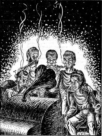 In a world deep down in Smallness, in an electron of a dead cell of a piece of wood, five scientists were grouped before a complicated instrument with a horn like the early radios. Two sat and three stood, but their attention upon the apparatus was unanimous. From small hollowed cups worn on their fingers like rings, came a smoke from burning incense. These cups they held to their noses frequently, and their eyes shone as they inhaled. The scientists of infra-smallness were smoking!