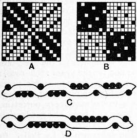 In its textile use, the term diaper was originally applied to silk patterns of a geometrical pattern; it is now almost exclusively used for diamond patterns made from linen or cotton yarns. An illustration of two patterns of this nature is shown in the figure. The floats of the warp and the weft are mostly in three; indeed the patterns are made from a base weave which is composed entirely of floats of this number. It will be seen that both designs are formed of what may be termed concentric figures—alternately black and white. Pattern B differs from pattern A only in that more of these concentric figures are used for the complete figure. If pattern B, which shows only one unit, were extended, the effect would be similar to A, except for the size of the unit. In A there are four complete units, and hence the pattern appears more striking. Again, the repeating of B would cause the four corner pieces to join and to form a diamond similar to the one in the centre. The two diamonds in B would then alternate diagonally to left and right. Special names are given to certain kinds of diapers, e.g. “bird’s-eye,” “pheasant’s-eye”; these terms indicate, to a certain extent, the size of the complete diamond in the cloth—the smaller kind taking the name “bird’s-eye.” The size of the pattern on paper has little connexion with the size of the pattern in the cloth, for it is clearly the number of threads and picks per inch which determine the size of the pattern in the cloth from any given design. Although A is larger than what is usually termed the “bird’s-eye” pattern, it is evident that it may be made to appear as such, provided that the cloth is fine enough. These designs, although adapted mostly for cloths such as nursery-diapers, for pinafores, &c., are sometimes used in the production of towels and table-cloths. In the figure, the first pick in A is identical with the first pick in B, and the part C shows how each interweaves with the twenty-four threads.
