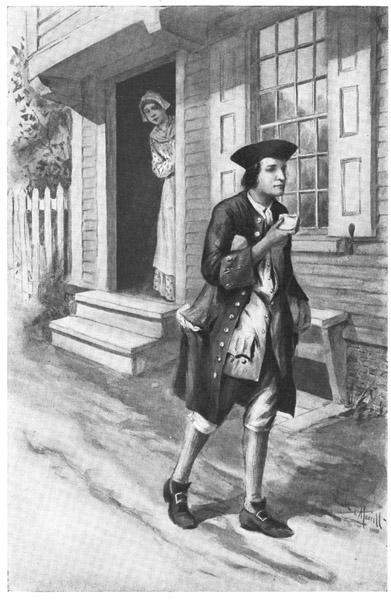 After five hard years of fighting, Washington went back to Mount Vernon, where he lived quietly and happily with a beautiful widow to whom he was married a few weeks after meeting her. When he and his bride[6] rode home to Mount Vernon, she was dressed in white satin and wore pearl jewels. Her coach was drawn by six white horses. Washington was dressed in a suit of blue, lined with red satin and trimmed with silver lace. He rode beside the coach on a chestnut horse, with soldiers attending him.