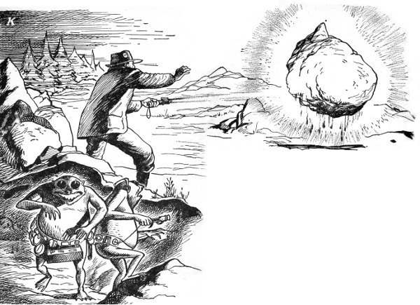 Clark whirled around and gasped in astonishment. Two squat dwarfish men crouched at the far side of the clearing. When he swung up his 16 gauge, two lights flashed, and it slid out of his hands. He buckled dizzily with weakness and nausea, but then an invisible force jolted him upright and motionless. He felt rigid as stone.