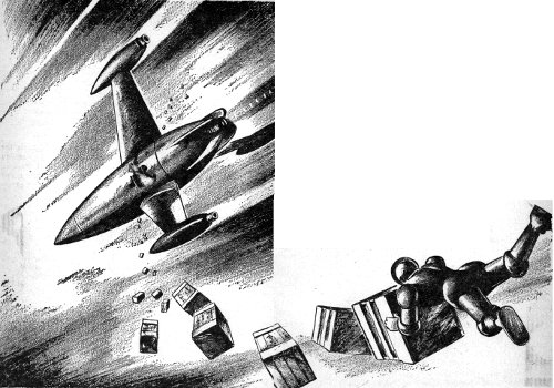 Shrugging fatigue from his body, he looked up at the panel. The massometer showed a decrease of six tons. The explanation was simple, Brad laughed dryly: A good one-quarter of his load of crated inter-calc audio retention banks had rammed through the hull and floated into space.