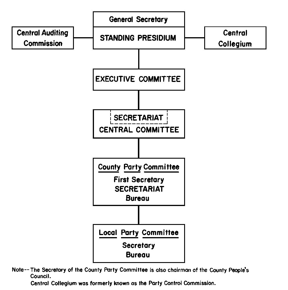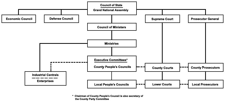 2. GOVERNMENT: Constitution of 1965 provides for a unicameral legislature and a collegial executive known as the Council of State. Romanian Communist Party controls elections and runs the government at all levels. Top party officials concurrently occupy top governmental offices. Ultimate political power rests in the party hierarchy, particularly in the person of the party general secretary who, since 1967, has also been head of state.