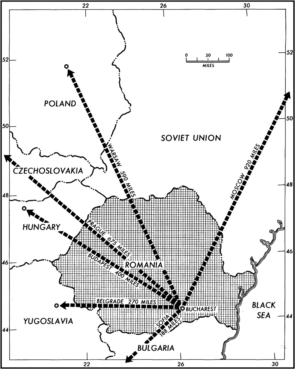 3. SIZE AND LOCATION: Area of over 91,700 square miles. In southeastern Europe, shares 1,975 miles of demarcated and undisputed land borders with Bulgaria, Yugoslavia, Hungary, and the Soviet Union. With 150 miles of shoreline, shares riparian rights on Black Sea with Turkey, Bulgaria, and the Soviet Union.