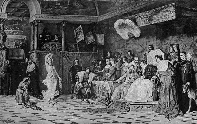 The queen-mother, ignorant of her son's marriage to Maria de Padilla, or deciding to ignore it, prevailed upon Pedro to ask for the hand of Blanche, the daughter of the Duke of Bourbon, and sister to Jeanne, wife to Charles, the heir of France. His request was granted, and the king sent his half-brother, the Master of Santiago, one of Leonora's sons, to fetch the bride to Spain. While this journey was being made, Pedro fell in love with one of the noble ladies in waiting of Doña Isabel of Albuquerque, and so great was his passion for this dark-eyed damsel that it was with difficulty that he could be prevailed upon to leave her and go to greet the French princess when she finally arrived in Valladolid. But he tore himself away, went to Blanche, and was married with great pomp and ceremony. Some had said before the marriage that Maria de Padilla must have bewitched Pedro, so great was his infatuation; and three days after the wedding a strange thing happened, which caused people to shake their heads again and suggest the interference of the powers of sorcery. For, after this short time, Pedro rode away from Valladolid and his new queen and went to Montalvao, where Maria de Padilla was waiting to receive him. Just what had happened, it is somewhat difficult to discover, and the story is told that the king, listening to scandalous talk, was made to believe that his royal messenger and half-brother, Fadrique, had played the rôle of Sir Tristram as he brought the lady back, and that she had been a somewhat willing Isolde. There were others who said that Blanche, knowing the king's volatile disposition and of his relations with the notorious Maria, had endeavored upon the eve of her marriage to seek aid from the arts of magic in her effort to win the love of her husband, and had obtained from a Jewish sorcerer a belt which she was told would make Pedro faithful, kind, and true. But the story goes on to say that this wizard had been bribed by Maria de Padilla; and when the king tried on the girdle which his wife presented, it forthwith was changed into a hideous serpent, which filled him with such disgust that he could no longer bear the sight of her. Don Alfonso of Albuquerque, who had first introduced Pedro to Maria de Padilla, now tried to take her away from him, in the hope that he might be prevailed upon to return to his wife, the unfortunate Blanche. This so angered the king that he resolved upon Don Alfonso's death, and if it had not been for the timely warning given by Maria, this gentleman would certainly have been assassinated. This action on Maria's part, however, was the occasion for a fresh outburst of anger; and Pedro left, wooed Doña Juana de Castro in stormy fashion, and induced her to marry him, on the statement that he had made a secret protest against Blanche and that the pope would soon annul this marriage. Thomas Hardy has said that the most delicate women get used to strange moral situations, and there must have been something of this in Juana's makeup, or she would never have been forced into so shameful a position; but, however that may be, she was made to rue the day, as the king left her the next morning for Maria, his Venus Victrix, and never went to see her again, although he gave her the town of Duefias and allowed her to be addressed as "queen." The chronicles of the time tell of the remarkable beauty of Maria and of the adulation she enjoyed in the heyday of her prosperity. As an instance of the extreme gallantry of the courtiers, we are informed that, with King Pedro, it was their custom to attend the lovely favorite at her bath and, upon her leaving it, to drink of its water.
