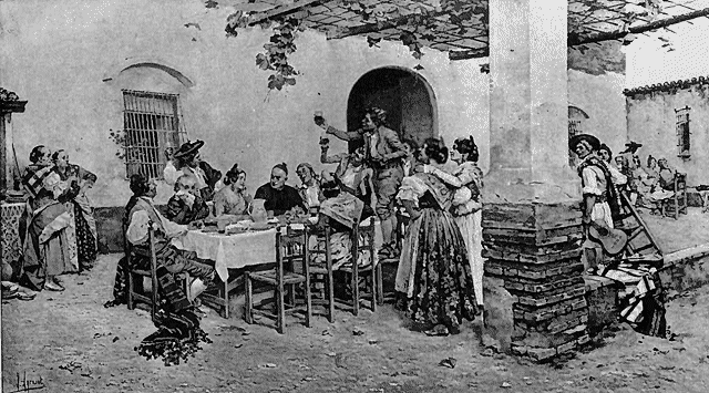 The national amusements of Spain, as they affect the whole people, may be reduced to two, bull-fighting and dancing. While women never take part in the contests of the arena, they are none the less among the most interested of the spectators, and the Plaza de Toros on a Sunday is the place to see their wonderfully brilliant costumes. With regard to Spanish dancing, as a popular amusement it is almost universal, and rarely are two or three gathered together but that the sound of the tambourine, guitar, and castanets is heard and the dance is in full swing. Much has been written about some of these national dances, and often the idea is left in the mind of the reader that they are all very shocking and indecent, but this is hardly the fact. Certain dances are to be seen in Spain to-day, among the gypsies, which have come down practically unchanged from the Roman days, when Martial and Horace were enchanted by the graceful motions of the dancing girls of their time; and these are undoubtedly suggestive in a high degree, and are not less objectionable than the more widely known Oriental dances which have recently made their advent into the United States; but these dances are in no way national or common. They are rarely seen, except in the gypsy quarter of Seville, and there they are generally arranged for money-making purposes. In short, they are no more typical of Spanish dances than the questionable evolutions of the old Quadrille at the Moulin Rouge were representative of the dances of the French people, and it is time that the libel should be stopped. The country people and the working classes dance with the enjoyment of children, and generally they sing at the same time some love song which is unending, and sometimes improvised as the dance proceeds.