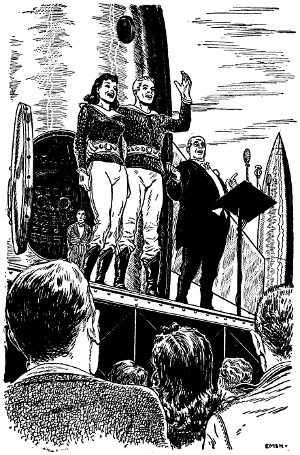 Ken turned his eyes to the crowd—a roaring, cheering multitude surrounding the poised rocket ship here on the California desert in this zero hour. To certain harried physicists and engineers, it was a moment promising paramount achievement. To romanticists of 1966, watching their video screens avidly, it was fulfillment of their most sensual dreams: a beautiful girl being given wholly and unreservedly to a handsome young man; the flight around the moon was merely an added fillip. To a few gaunt military psychologists it was the end of a long nightmare of protests by women's clubs, demonstrations by national female societies and actual attempts at murder by fanatical blue-noses; and a mere beginning of the most crucial experiment ever undertaken—which had to be a success.