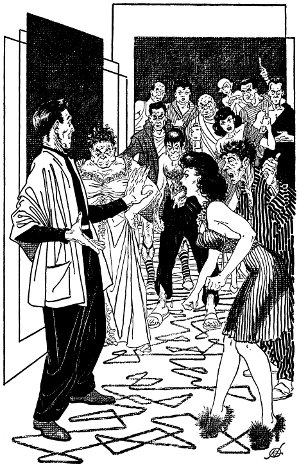 "Attaboy, Sexy," a shrill female voice piped. The roof-top was jammed with a pressing throng of—nearly naked people. In the cleared semi-circle about him a cordon of male bodies-beautiful restrained the mob behind a rope from which a long streamer hung with letters reading: