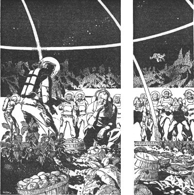 "Have another tomato, Neely. Sorry to do things like this—but it's your own way. So why should you complain? Funny, ain't it? A man can get even too many tomatoes. Civilized tomatoes. Part of something most guys around here have been homesick for, for a long time.... Maybe that's what has been most of the trouble out here in the asteroids. Not enough civilization. On Earth we were used to certain standards—in spite of being rough enough there, too. Here, the traces got kicked over. But on this side of Vesta, an idea begins to soak in: This used to be nice country—blue sky, trees growing. Some of that is coming back, Neely. And order with it. Because, deep in our guts, that's what we all want. And fresh vegetables'll help.... Have another tomato, Neely. Or should we call it enough, guys?"