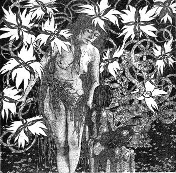 Now she was under the Tree, and its trunk had writhed down over her and she was lifting her arms like a girl to her lover. With a gliding slowness the flame-tipped branches slid round her. In that incredible embrace she stood immobile for a long moment, the Tree arching down with all its curling limbs, the girl straining upward, her head thrown back and the mantle of her hair swinging free of her body as she lifted her face to the quivering blossoms. The branches gathered her closer in their embrace. Now the blossoms arched near, curving down all about her, touching her very gently, twisting their blazing faces toward the focus of her moon-white body. One poised directly above her face, trembled, brushed her mouth lightly. And the Tree's tremor ran unbroken through the body of the girl it clasped.