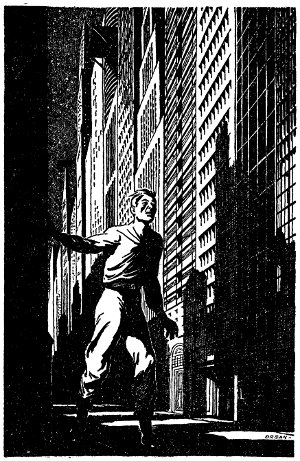 Fear came, now that he was in that land where men never walked. The buildings loomed around him, forbidding and dark. Further down the street the lights began, spaced at intervals on the walls.