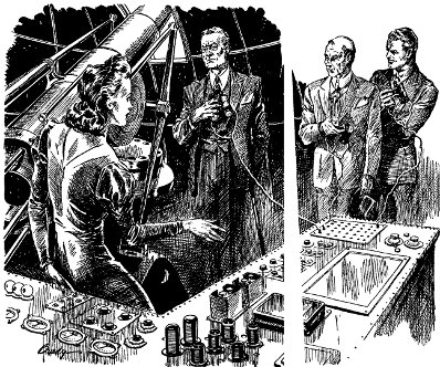 Half an hour later, she had led them into the University laboratory, a corner of which had been partitioned off. There a twenty-four-inch telescope-like tube shot up through the ceiling; while nearer at hand was a table covered with complicated electrical devices.