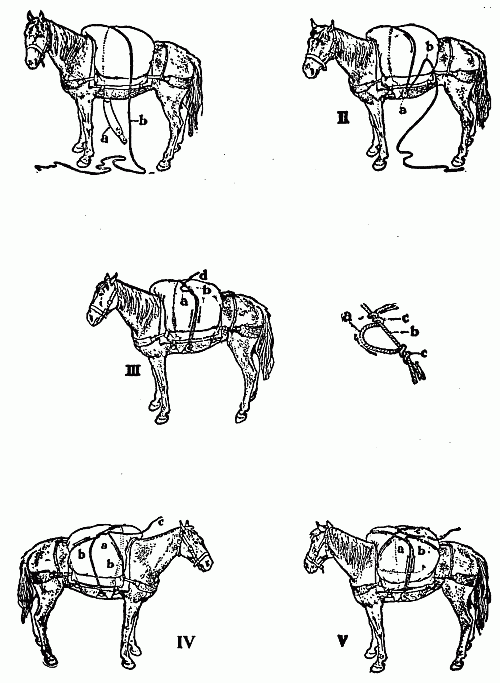Next, still holding the slack (Fig. V), carry the loose end around the bottom of the alforjas and under the original main pack rope (c). Now pull again along the direction[179] of the horse's body, but this time toward his tail. The strain will bend the pack rope (c), heretofore straight across, back to form the diamond. It will likewise drag back to its original position amidships in the pack the entire hitch, which, you will remember, was drawn too far forward by your previous pull toward the horse's head. Thus the last pull tightens the entire pack, clamps it down, secures it immovably, which is the main recommendation and beautiful feature of the diamond hitch.