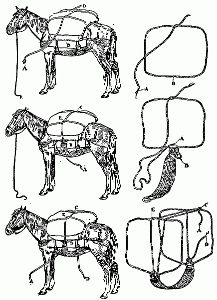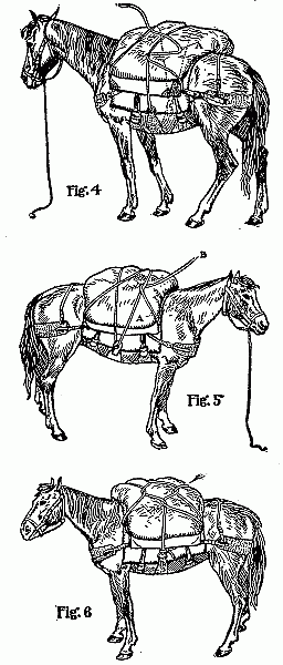 6. The Lone Packer or Basco Hitch.—This is a valuable hitch when the kyacks are heavy or knobby, because the last pull lifts them away from the horse's sides. It requires at least forty feet of rope. I use it a great deal.