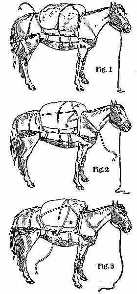 The detailment of processes by diagram must necessarily be rather dull reading. It can be made interesting by an attempt to follow out in actual practice the hitches described. For this purpose you do not need a full-size outfit. A pair of towels folded compactly, tied together, and thrown one[171] each side over a bit of stove wood to represent the horse makes a good pack, while a string with a bent nail for cinch hook will do as lash rope. With these you can follow out each detail.