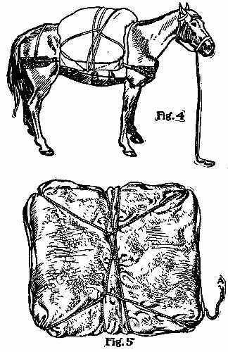 7. The Squaw Hitch.—Often it may happen that you find yourself possessed of a rope and a horse, but nothing else. It is quite possible to pack your equipment with only these simple auxiliaries.