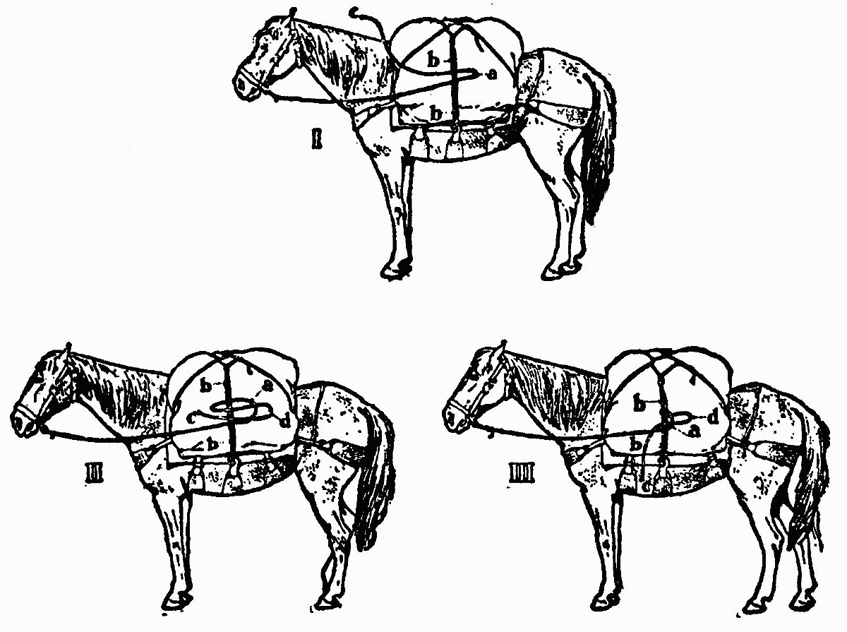 Now go around to the other side of the animal. Pass the loose end (d, Fig. III) back, under the alforjas, forward and through the loop from below as shown by the arrows of direction in Fig. IV.