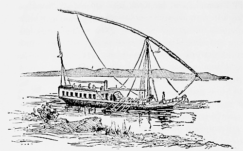 The gunwales were three or four feet high and[Pg 8] five or six inches thick. They appeared to be baked hard by the sun, and were water proof, as I afterwards saw several of them loaded so heavily that a great part of the mud gunwales were under water. I suppose mud is used in preference to wood, because wood is very scarce in Egypt and mud is very plentiful. They make the most of the mud which the Nile brings down in such quantities every year. They build houses with it as well as boats and it is this mud which manures and fertilizes the whole land of Egypt.