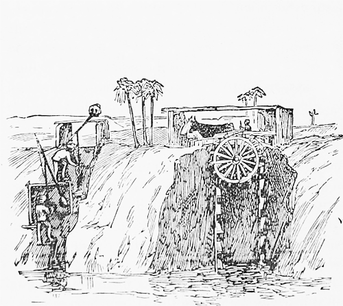 The next novel sight was the irrigation of the fields. To lift the water from the river, a frame is made by putting some cornstalks into the ground and putting clay round them to make posts, which are placed about six feet apart; the posts support a small stick, across which is laid a crooked pole, with about a dozen bends in it, that balances a mud basket on one end against a leather bucket on the other. The bucket holds about as much as our common well bucket, a man is continually filling from the river and emptying[Pg 11] into a mud spout between the posts. The water is led off in a small mud conduit over the farm which is divided into sections, when one section is filled with water the stream is turned into another one. These waterworks are kept going day and night. Once in a while one may see cattle power used for irrigation of the following old fashioned kind, the yoke is hitched to a primative cog-wheel of about twelve feet in diameter, which works into a smaller wheel placed underneath it, the cattle walking over a bridge. The cogs are simply pins driven into the outside of each wheel. The shaft of the smaller wheel runs out over a ditch cut from the river and carries a large reel about eighteen feet in diameter over which two native ropes are laid to which are attached about forty earthen jars. The cattle here are about the same size as ours, but they have a lump on their back and their horns run straight back. The colour of most of these cattle is blueish. Where the fertile strip of land is wide, canals are dug in curves to bring the water back near, to the sand mountains. The cattle feed along the river bank, which is left uncultivated for about twenty feet from the water, and I have seen a number of them of all kinds, feeding on this poor strip and never touch the rich crops alongside, although left to themselves and I was told that they were taught that way. The sheep look like dogs dragging long tails on the ground and the dogs look much like the Esquimaux dogs I have seen in Manitoba.