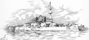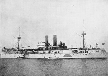 "At seven a.m. the Spanish flagship Reina Cristina made a desperate attempt to leave the line and come out to engage at short range, but was received with such a galling fire, the entire battery of the Olympia being concentrated upon her, that she was barely able to return to the shelter of the point. The fires started in her by our shells at the time were not extinguished until she sank. The three batteries at Manila had kept up a continuous fire from the beginning of the engagement, which fire was not returned by my squadron. The first of these batteries was situated on the south mole-head at the entrance of the Pasig River, the second on the south position of the walled city of Manila, and the third at Molate, about one-half mile further south. At this point I sent a message to the Governor-General to the effect that if the batteries did not cease firing the city would be shelled. This had the effect of silencing them.