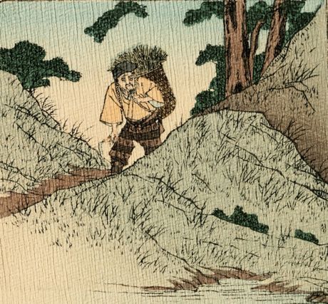 Momotaro finding that he excelled every body in strength determined to cross over to the island of the devils, take their riches, and come back. He at once consulted with the old man and the old woman about the matter, and got them to make him some dumplings. These he put in his pouch. Besides this he made every kind of preparation for his journey to the island of the devils and set out.
