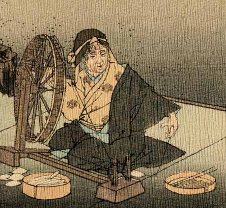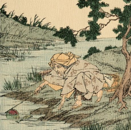 A long long time ago there lived an old man and an old woman. One day the old man went to the mountains to cut grass; and the old woman went to the river to wash clothes. While she was washing a great big thing came tumbling and splashing down the stream. When the old woman saw it she was very glad, and pulled it to her with a piece of bamboo that lay near by.