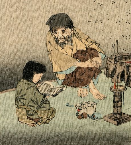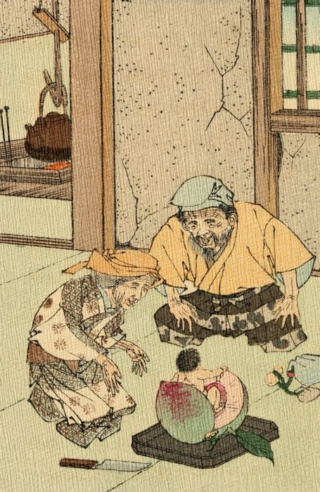 When she cut the peach in two, out came a child from the large kernel. Seeing this the old couple rejoiced, and named the child Momotaro, or Little Peachling, because he came out of a peach. As both the old people took good care of him, he grew and became strong and enterprising. So the old couple had their expectations raised, and bestowed still more care on his education.