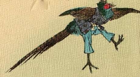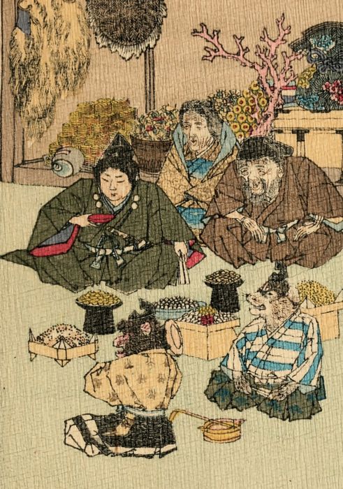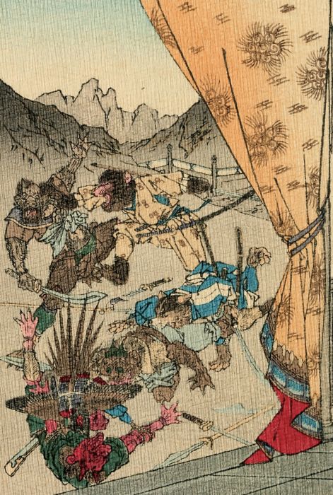 Then first a dog came to the side of the way and said; "Momotaro! What have you there hanging at your belt?" He replied: "I have some of the very best Japanese millet dumplings." "Give me one and I will go with you," said the dog. So Momotaro took a dumpling out of his pouch and gave it to the dog. Then a monkey came and got one the same way. A pheasant also came flying and said: "Give me a dumpling too, and I will go along with you." So all three went along with him. In no time they arrived at the island of the devils, and at once broke through the front gate; Momotaro first; then his three followers. Here they met a great multitude of the devil's retainers who showed fight, but they pressed still inwards, and at last encountered the chief of the devils, called Akandoji. Then came the tug of war. Akandoji made at Momotaro with an iron club, but Momotaro was ready for him, and dodged him adroitly. At last they grappled each other, and without difficulty Momotaro just crushed down Akandoji and tied him with a rope so tight that he could not even move. All this was done in a fair fight.